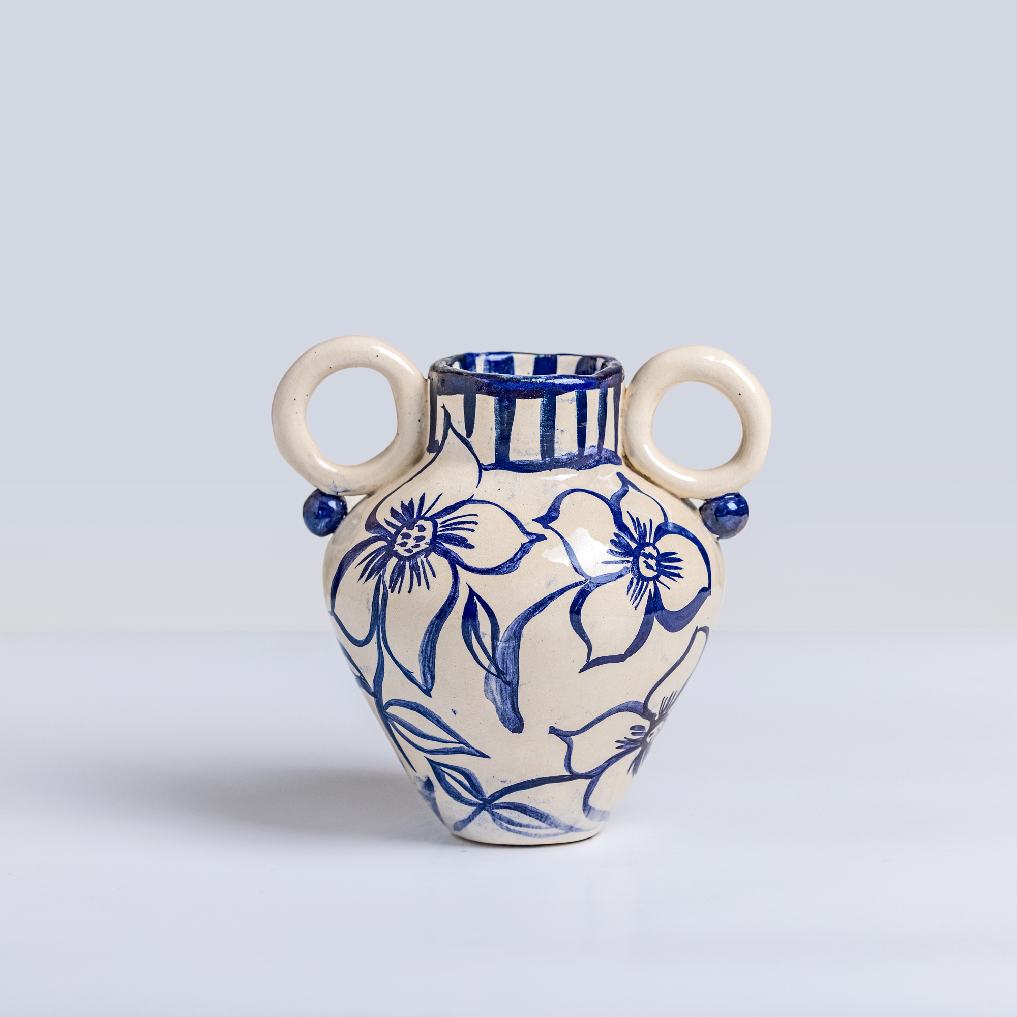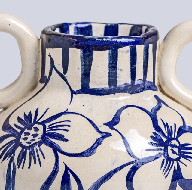 Low-temperature clay pieces are made with the ancient technique of rolling, which allows unique works to be built with free lines. Hand-painted with slip. Finished with shiny glaze on the interior and exterior.