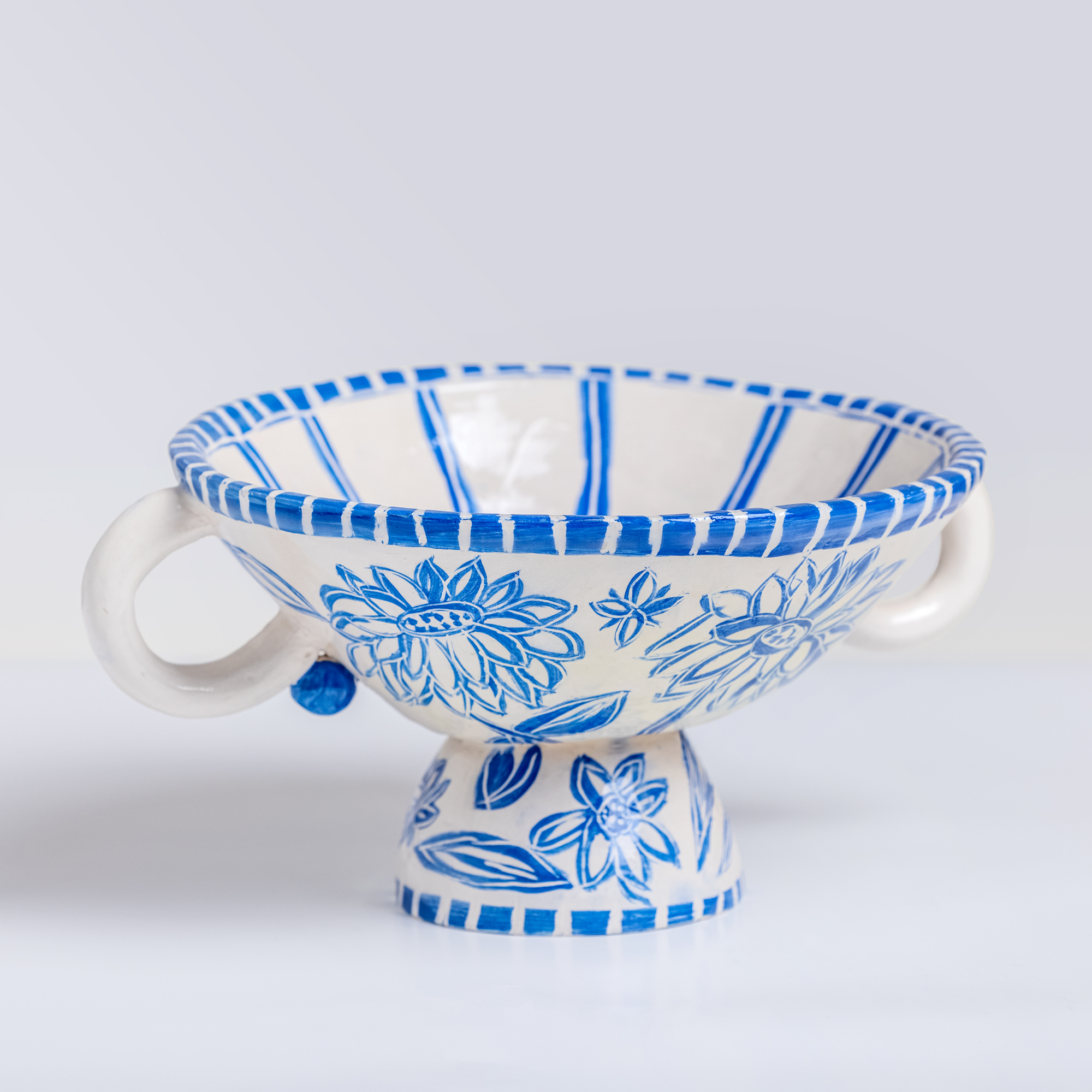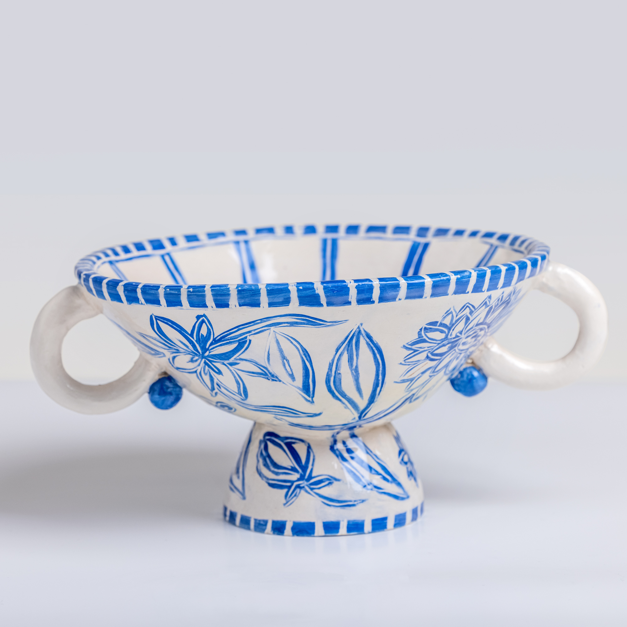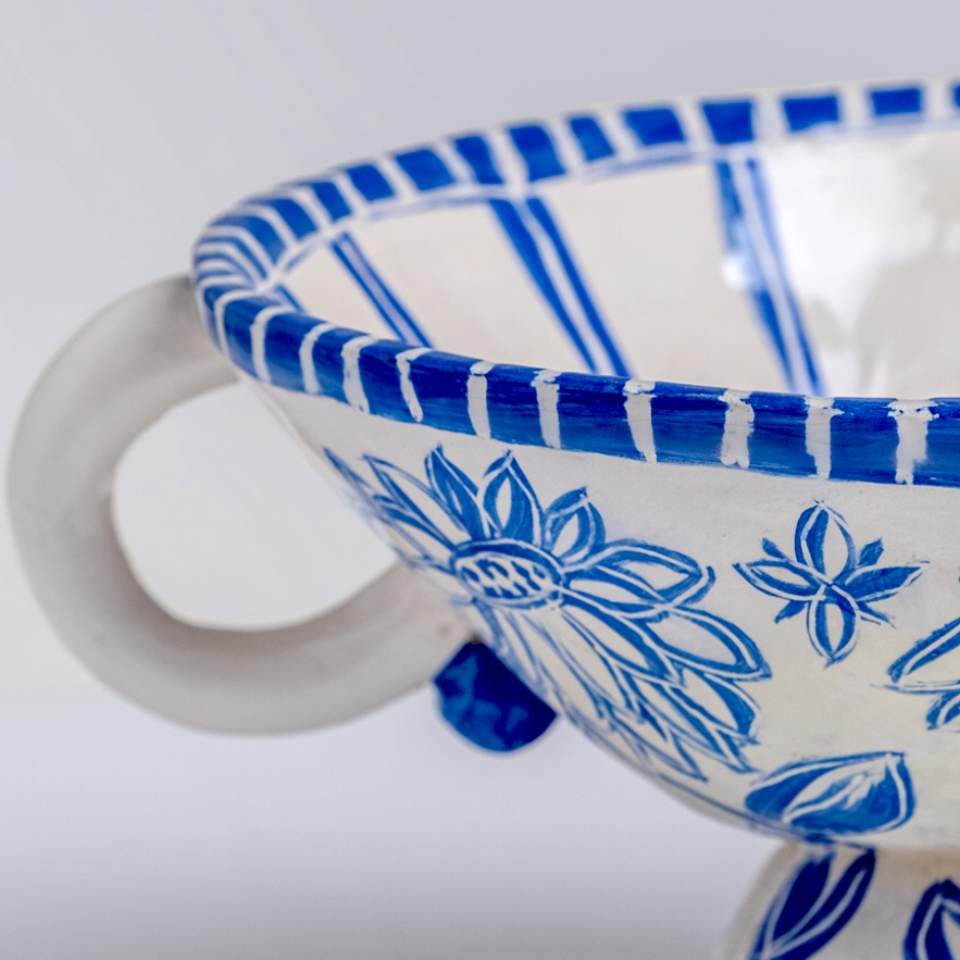 Low-temperature clay pieces are made with the ancient technique of rolling, which allows unique works to be built with free lines. Hand-painted with slip. Finished with shiny glaze on the interior and exterior.