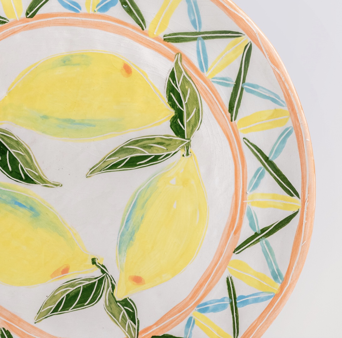 Low-temperature clay pieces are made with the ancient technique of rolling, which allows unique works to be built with free lines. Hand-painted with slip. Finished with a shiny glaze.