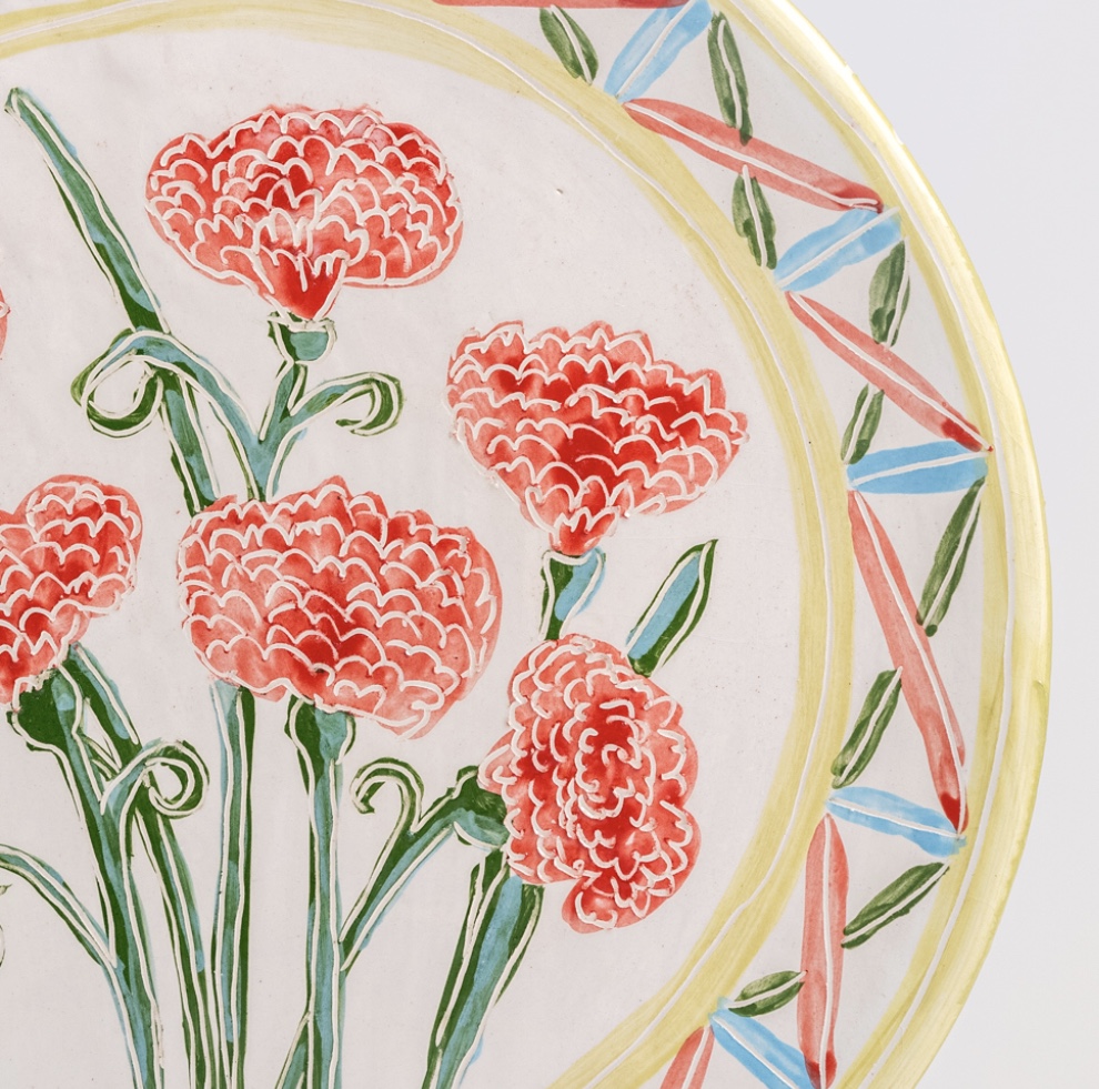 Low-temperature clay pieces are made with the ancient technique of rolling, which allows unique works to be built with free lines. Hand-painted with slip. Finished with a shiny glaze.