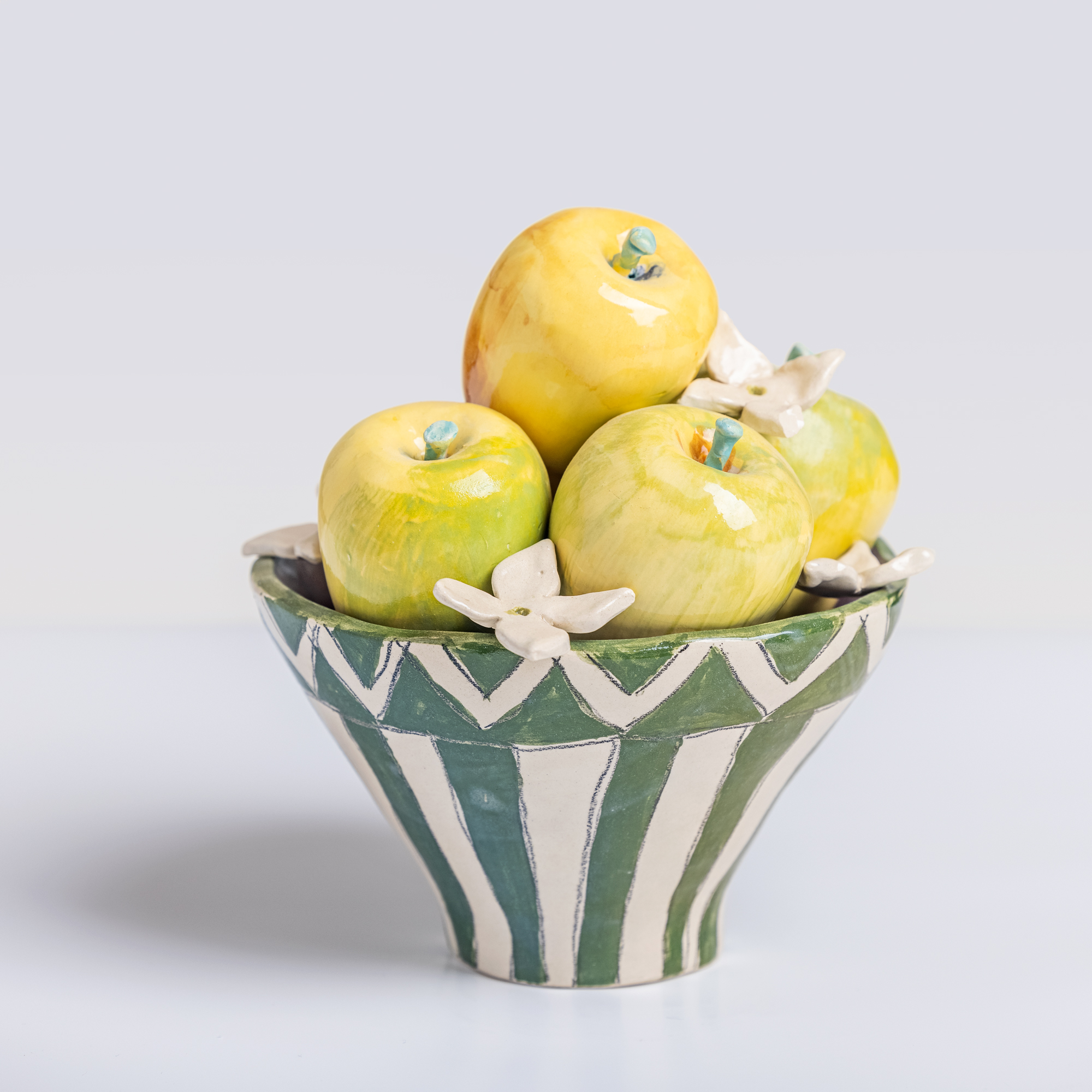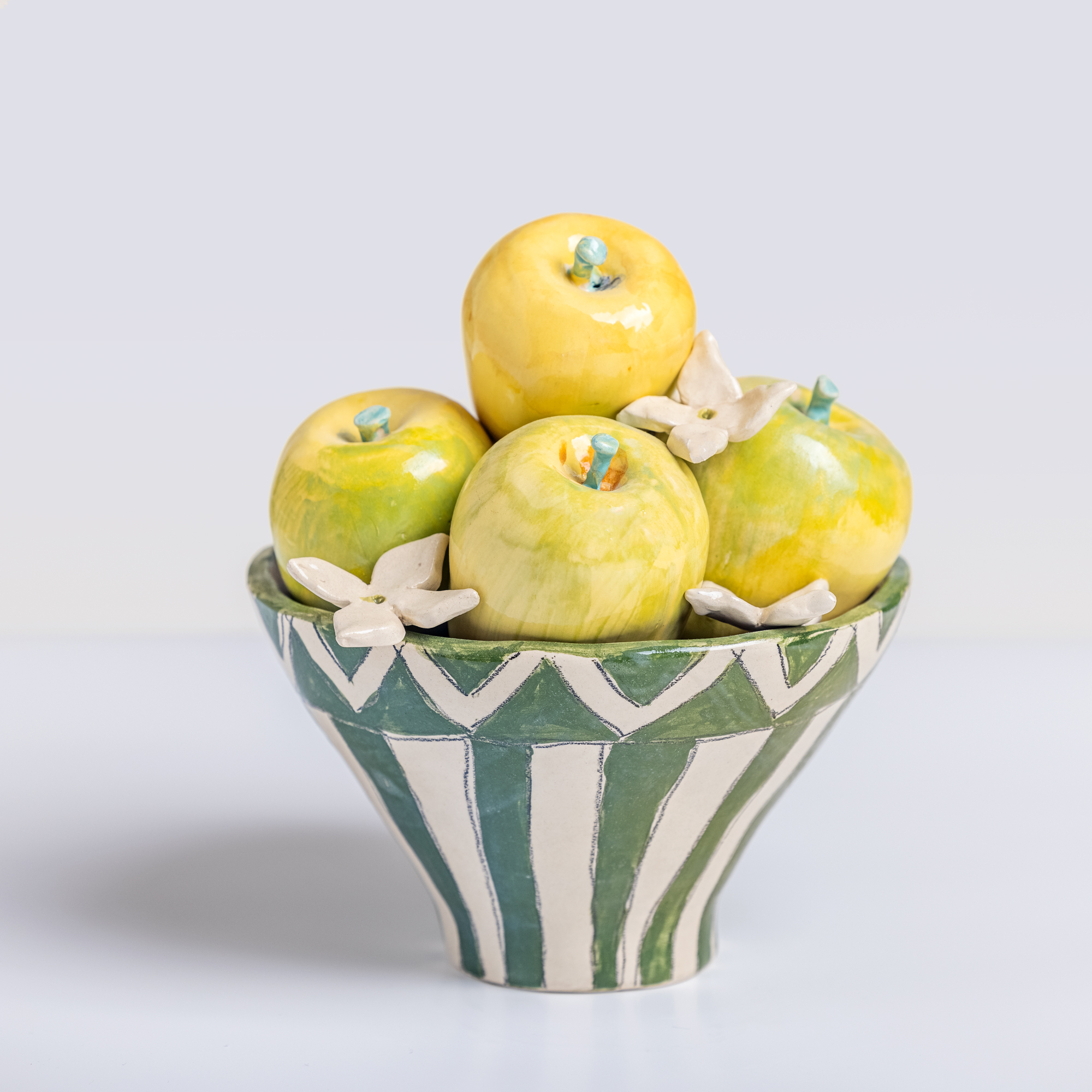 Low-temperature clay pieces are made with the ancient technique of rolling, which allows unique works to be built with free lines. Hand-painted with slip. Finished with shiny glaze on the interior and exterior.