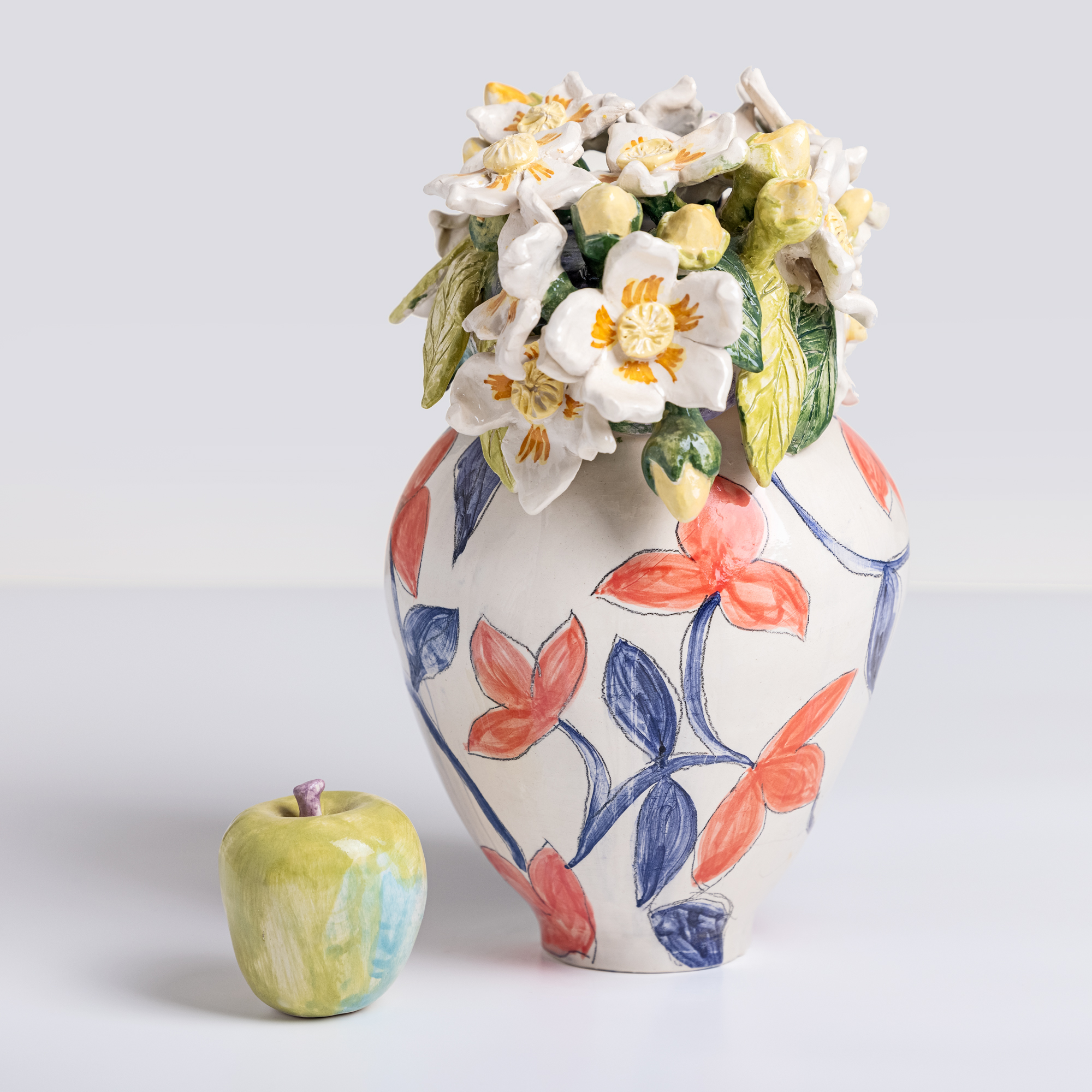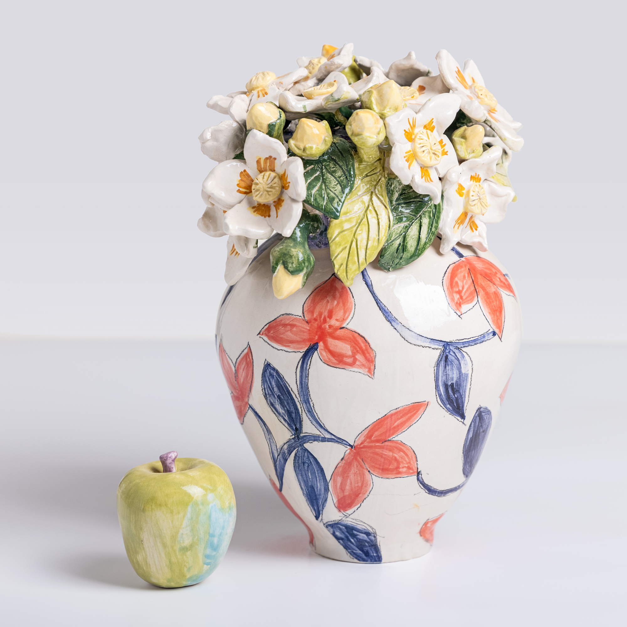 Low-temperature clay pieces are made with the ancient technique of rolling, which allows unique works to be built with free lines. Hand-painted with slip and “sgraffiato” technique. Finished with shiny glaze on the interior and exterior.
