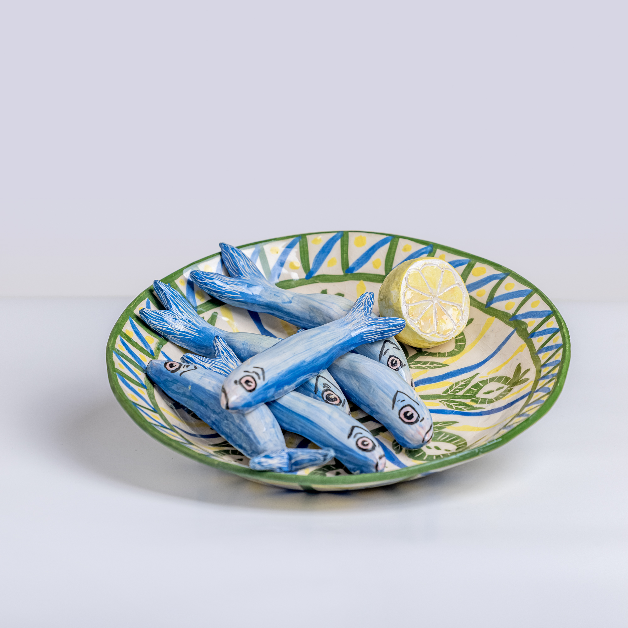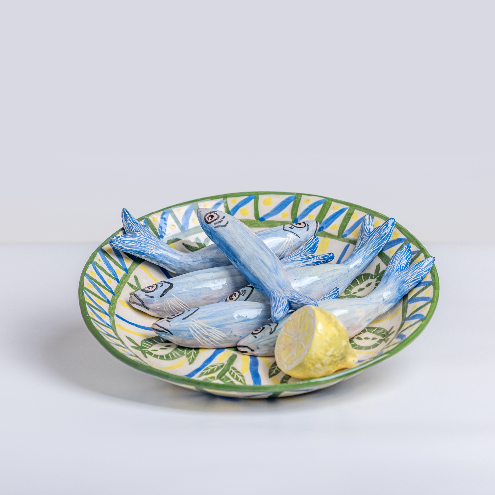 Low-temperature clay pieces are made with the ancient technique of rolling, which allows unique works to be built with free lines. Hand-painted with slip. Finished with shiny glaze on the interior and exterior.