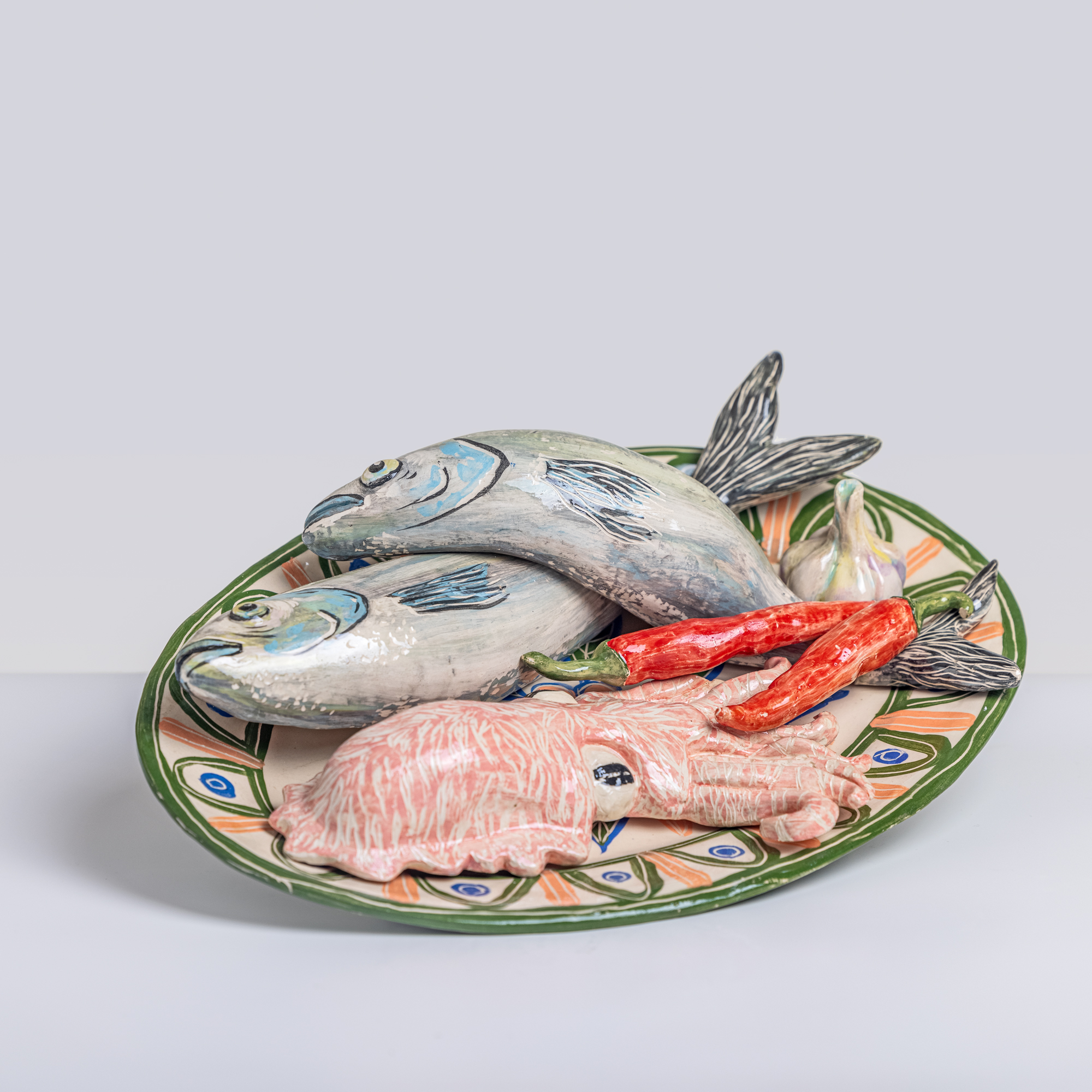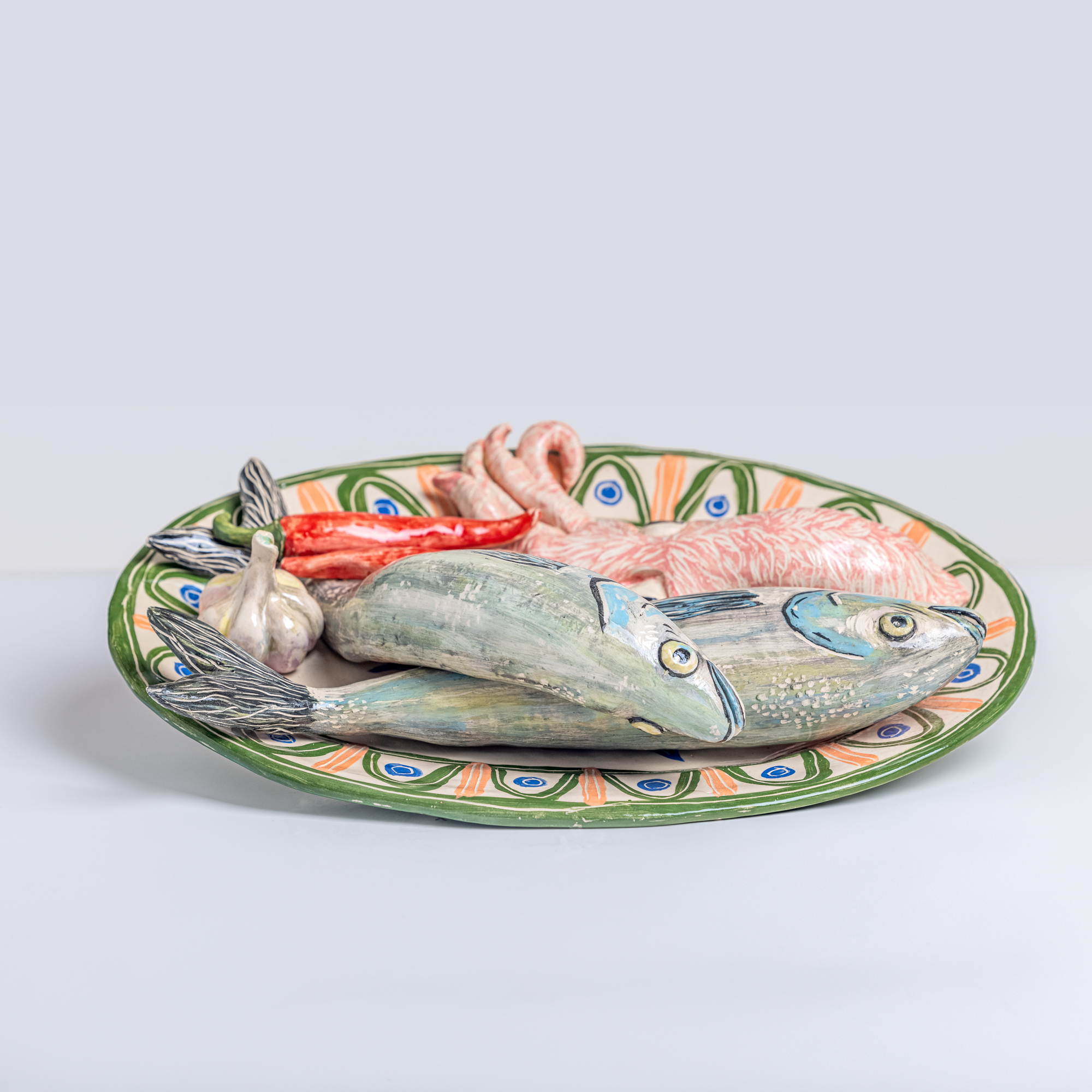 Low-temperature clay pieces are made with the ancient technique of rolling, which allows unique works to be built with free lines. Hand-painted with slip. Finished with shiny glaze on the interior and exterior.