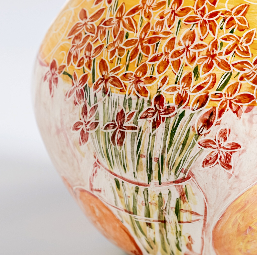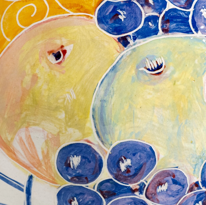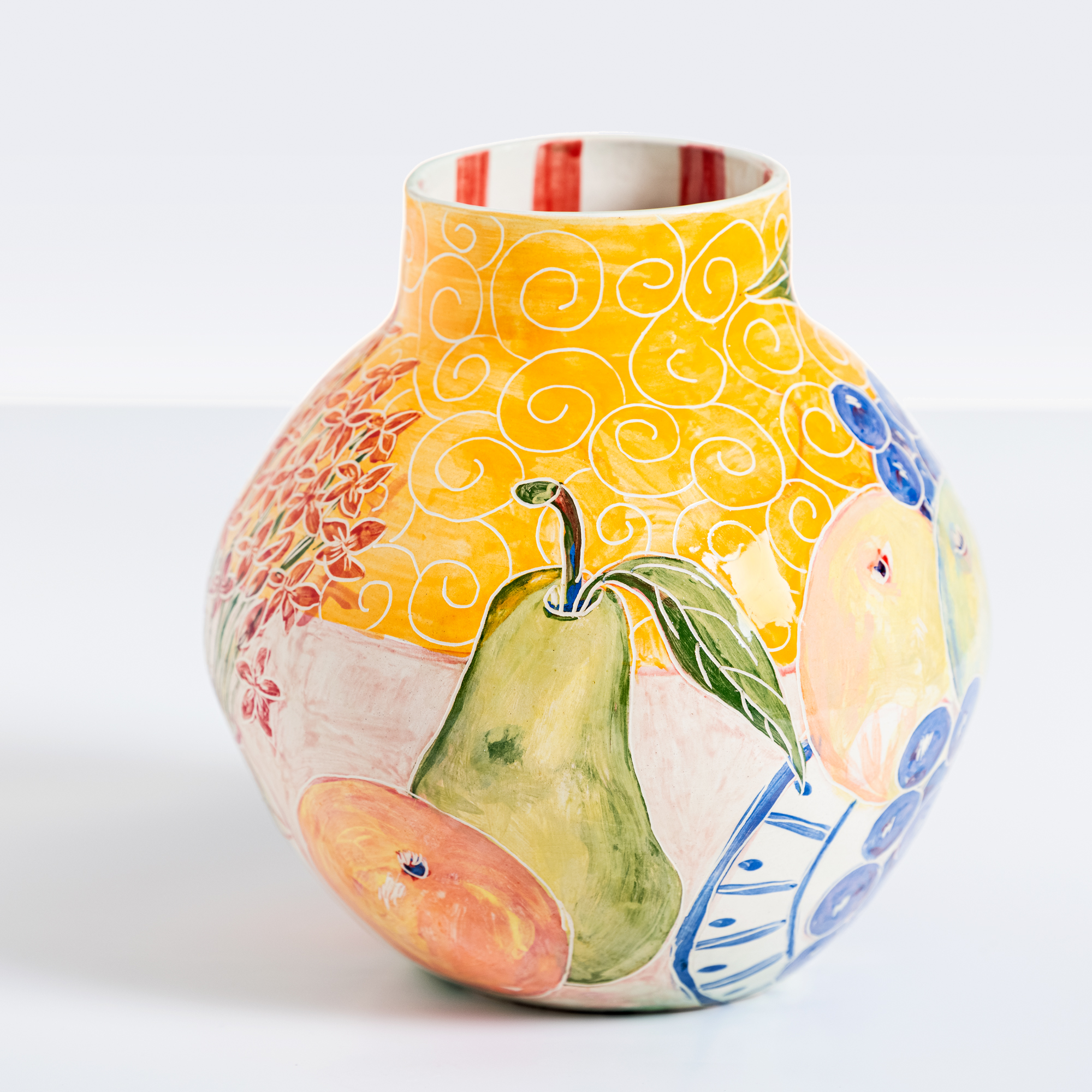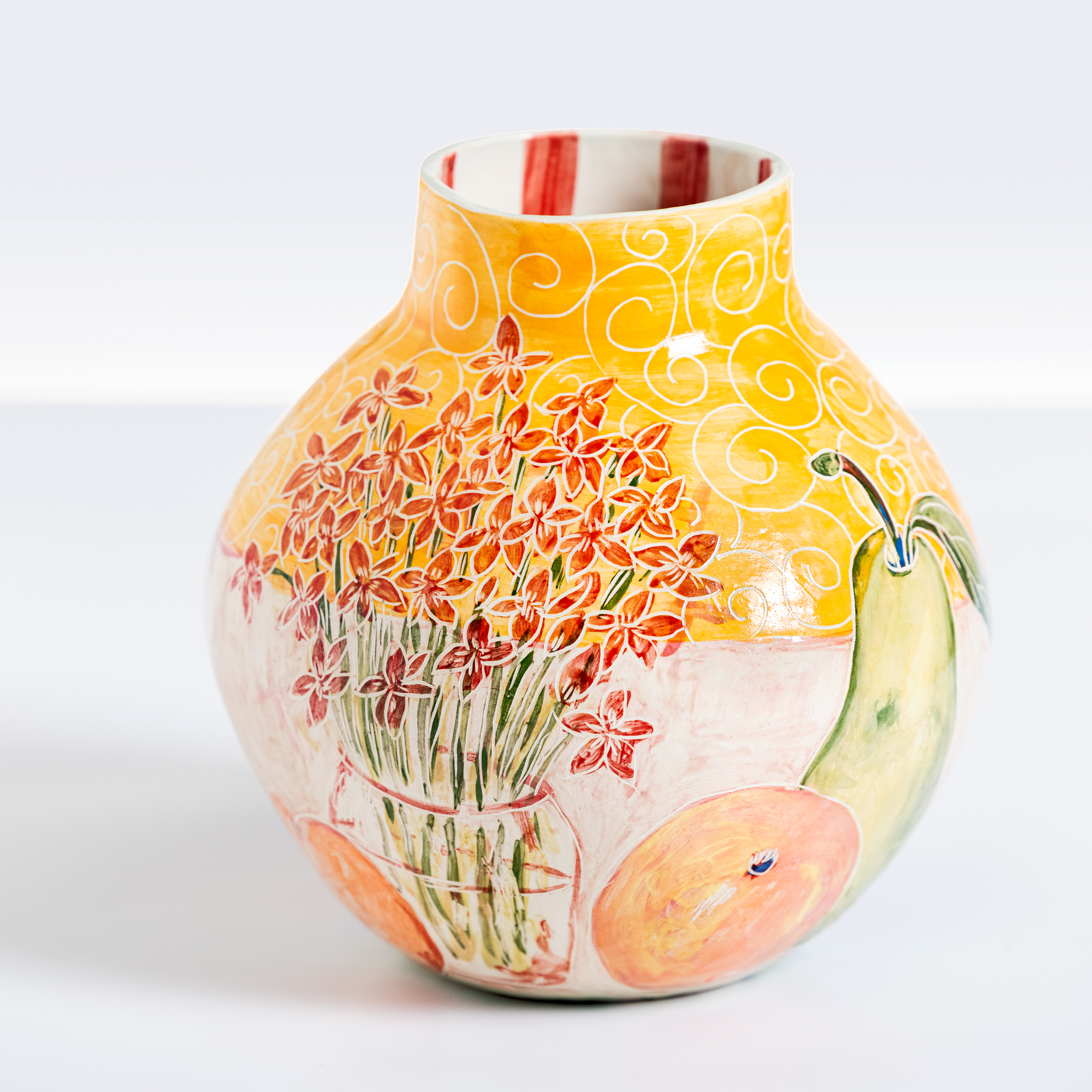 Low-temperature clay pieces are made with the ancient technique of rolling, which allows unique works to be built with free lines. Hand-painted with slip. Finished with shiny glaze on the interior and exterior.