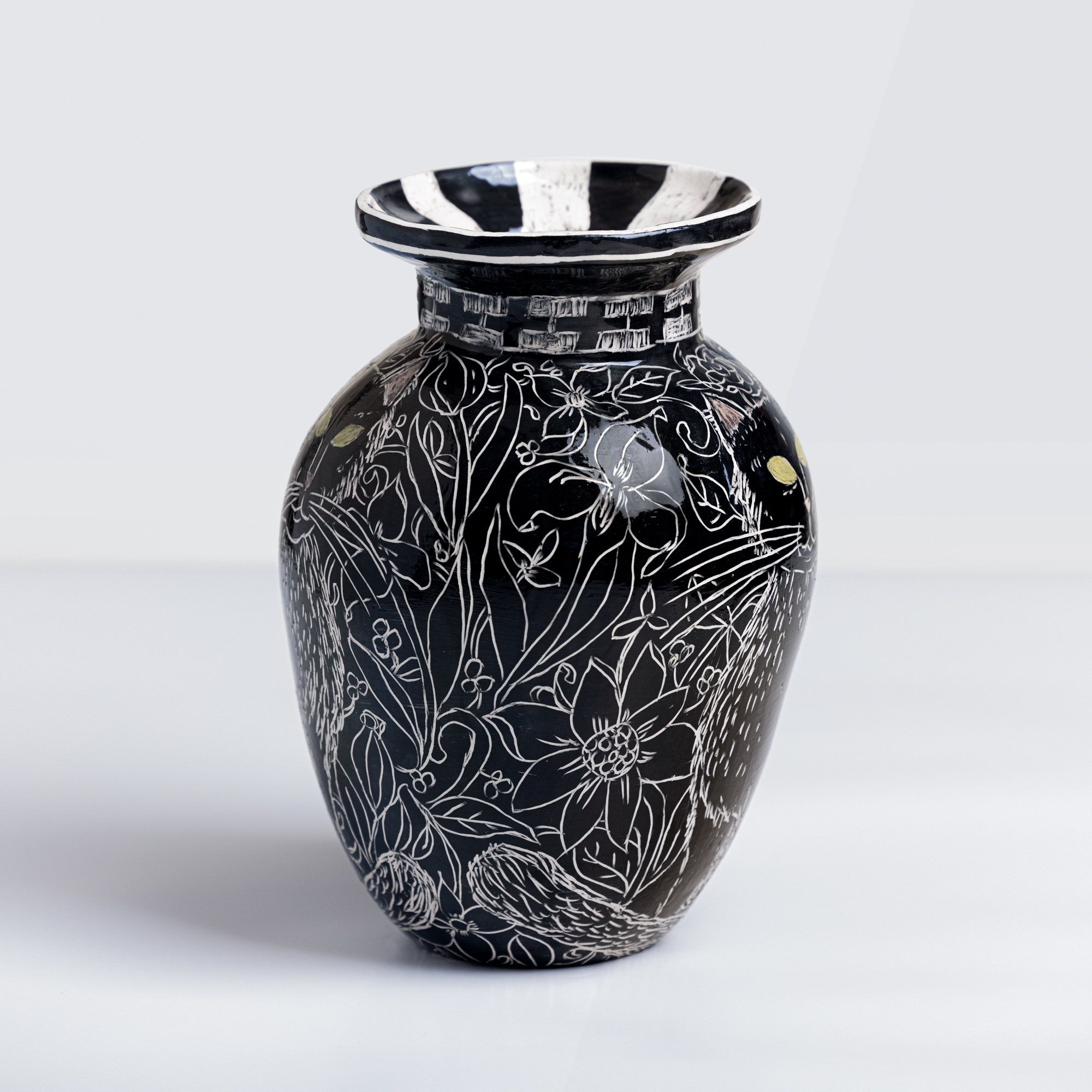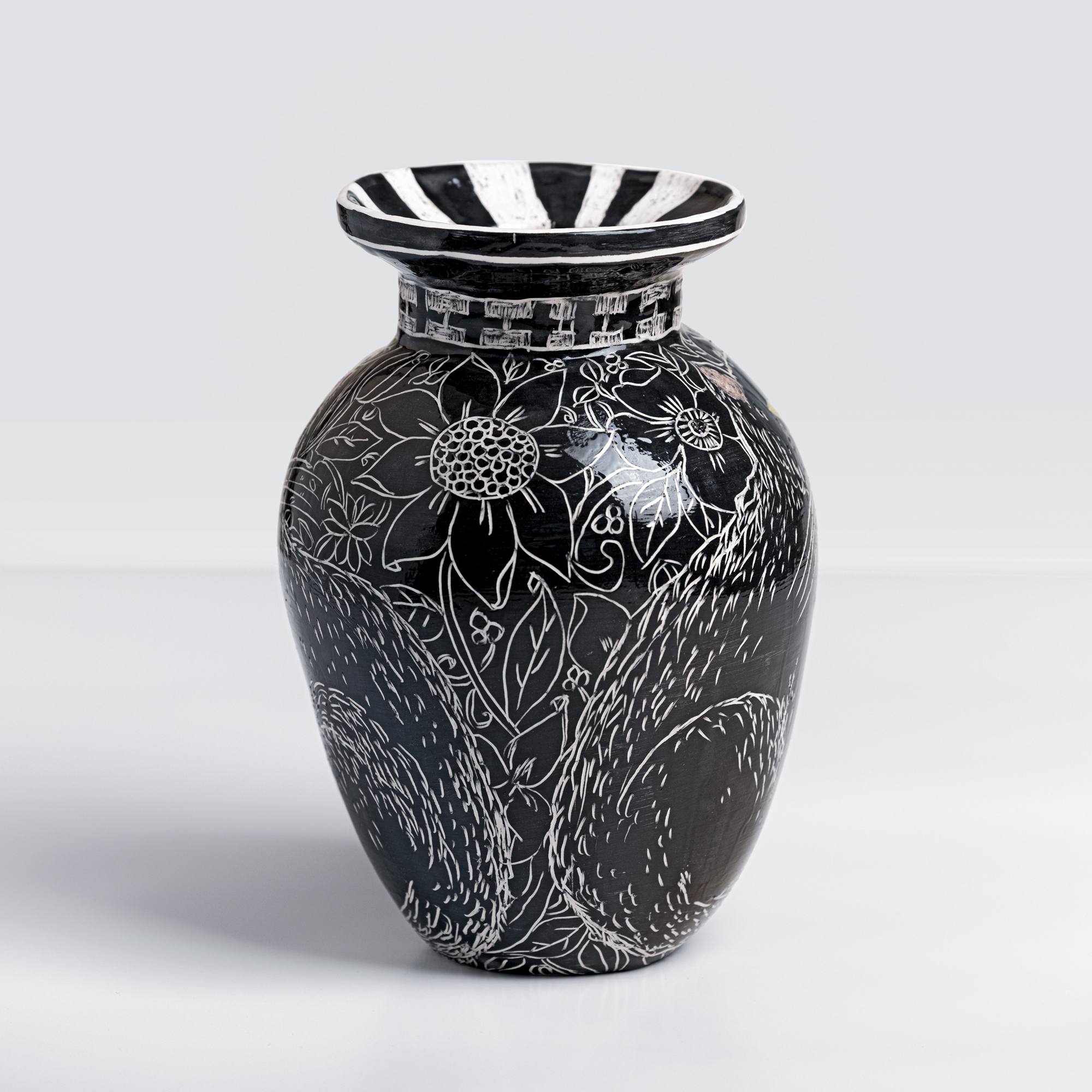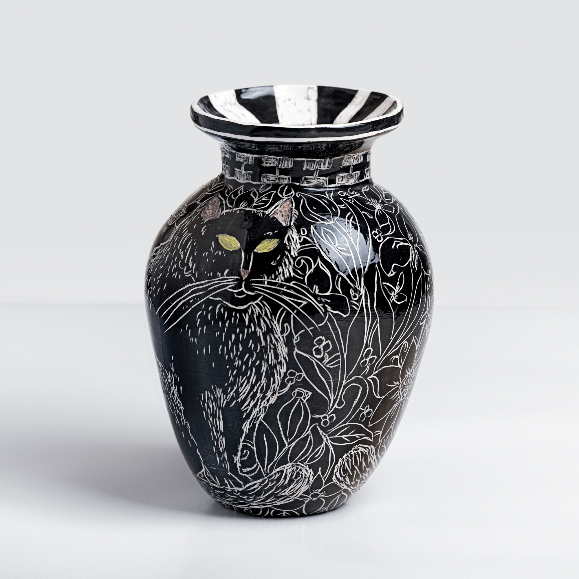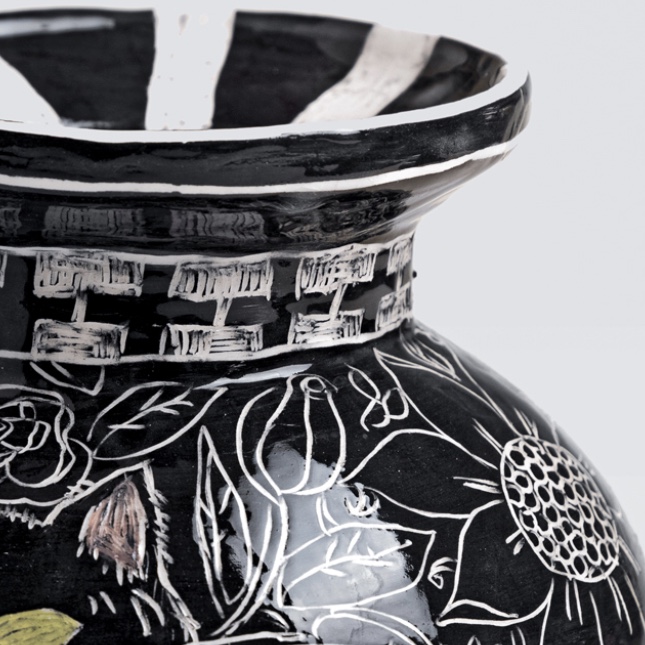 Low-temperature clay pieces are made with the ancient technique of rolling, which allows unique works to be built with free lines. Hand-painted with slip and “sgraffiato” technique. Finished with shiny glaze on the interior and exterior.