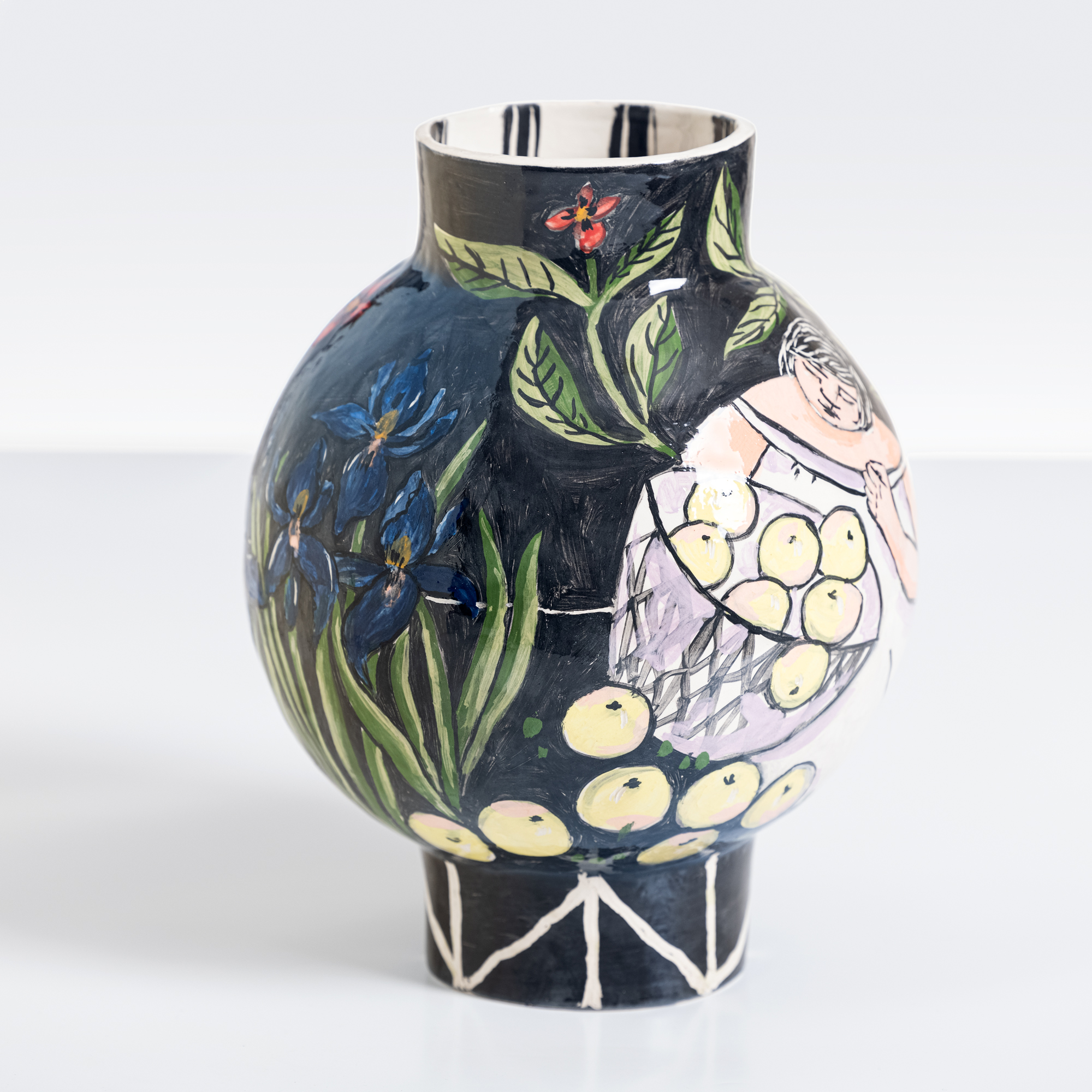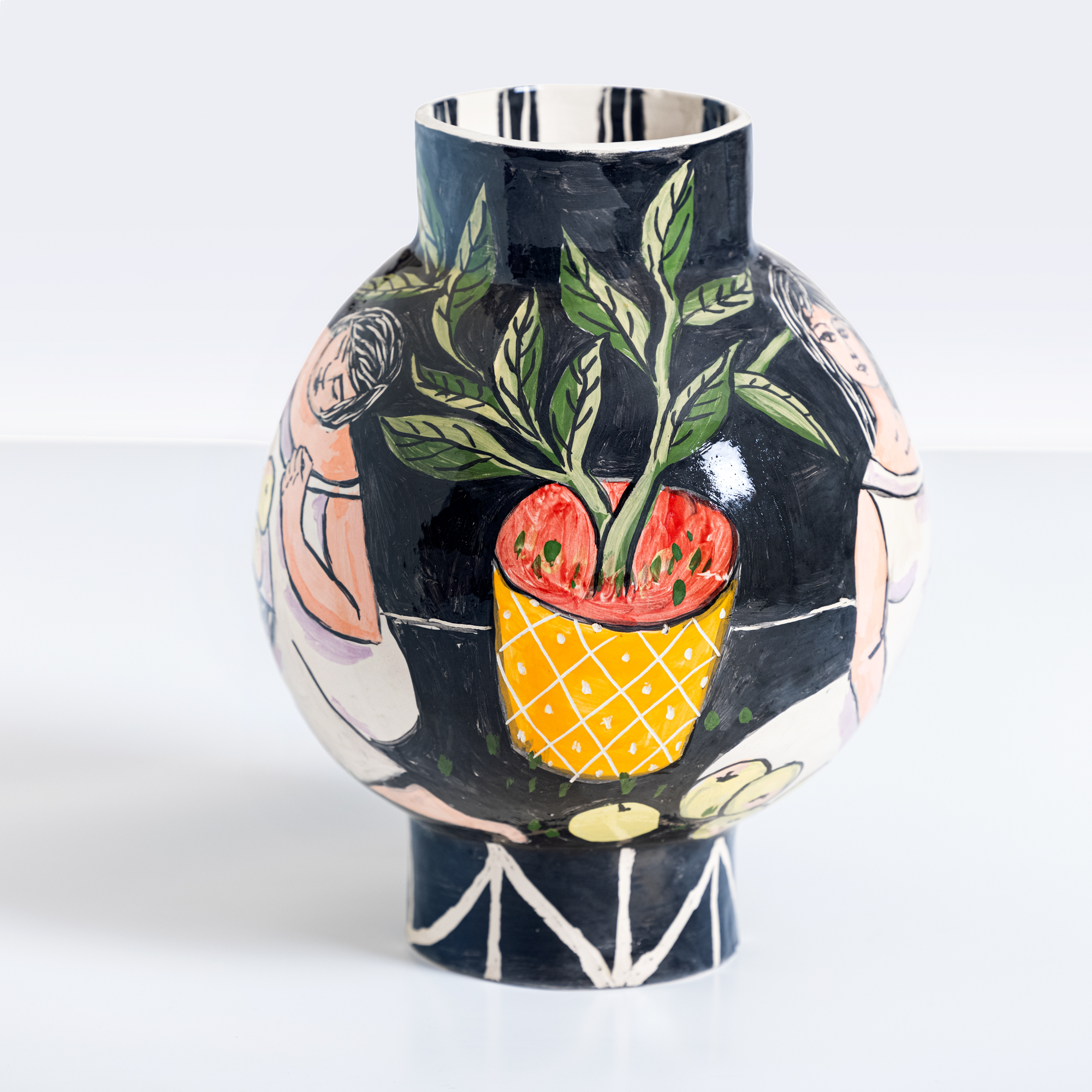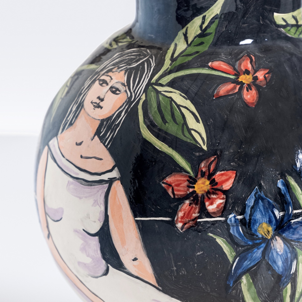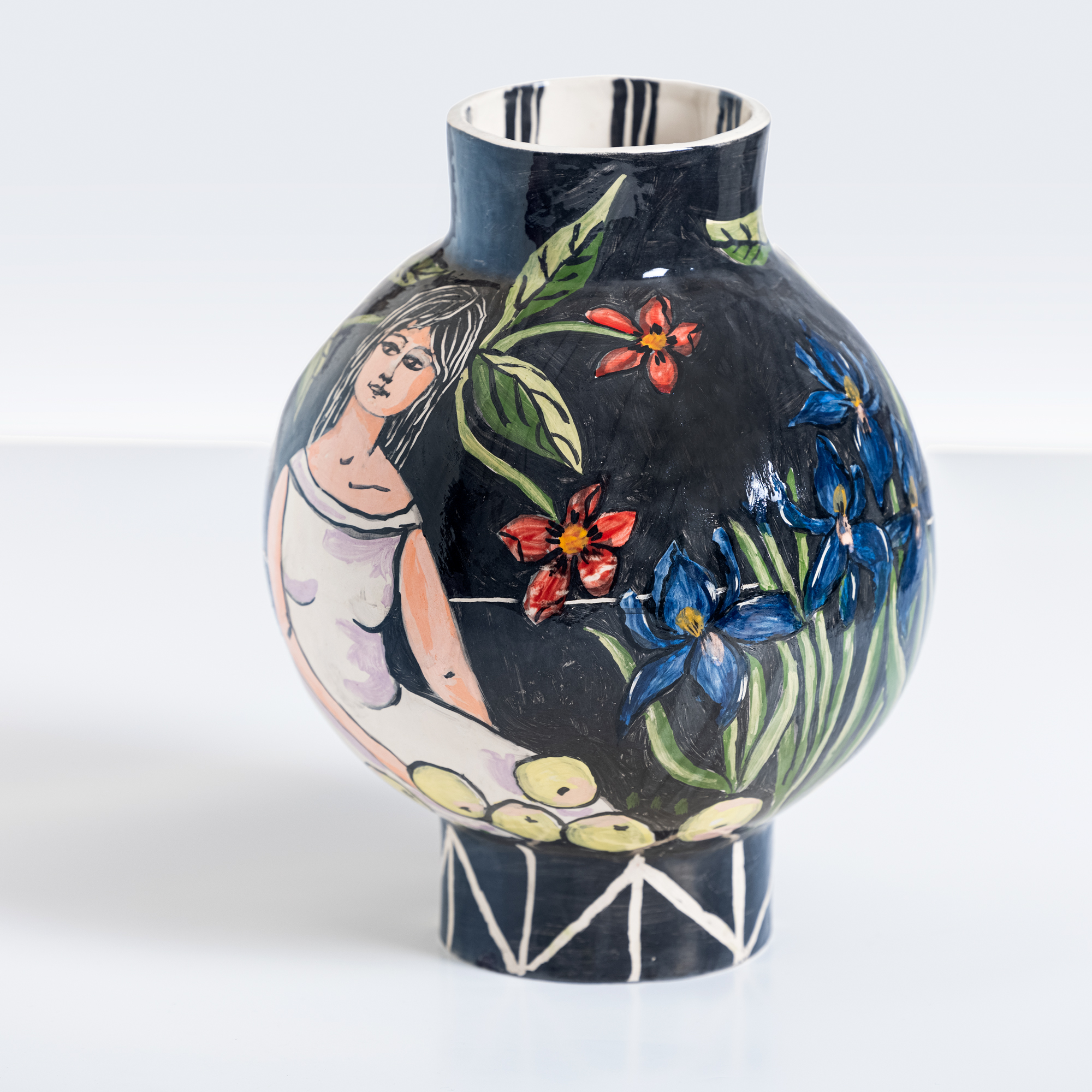 Low-temperature clay pieces are made with the ancient technique of rolling, which allows unique works to be built with free lines. Hand-painted with slip. Finished with shiny glaze on the interior and exterior.