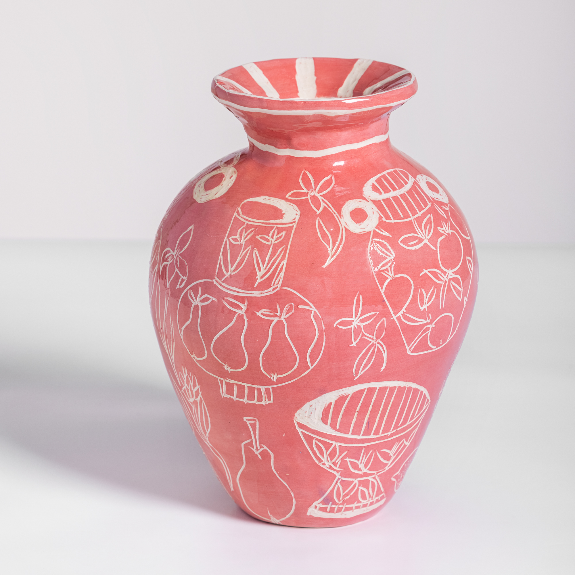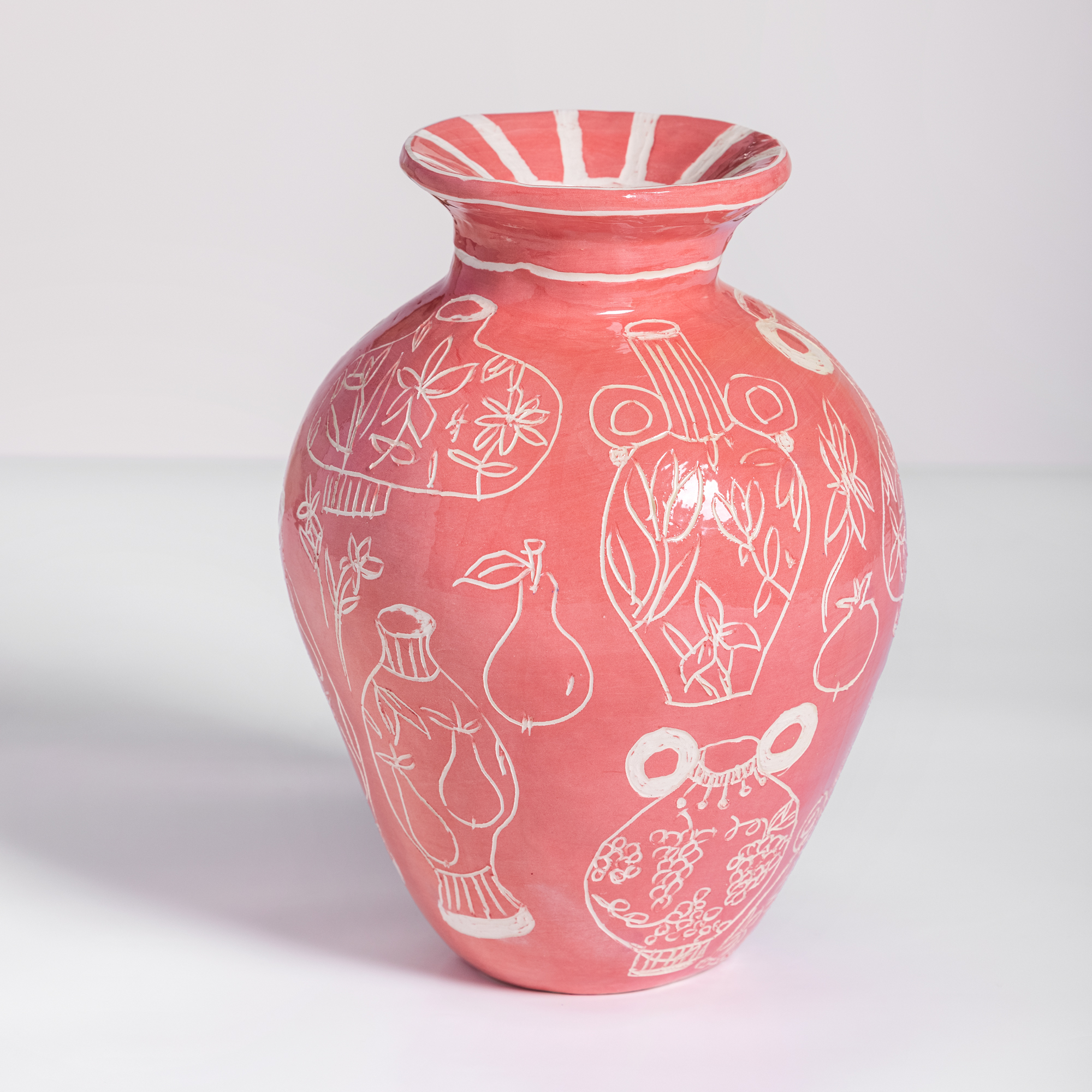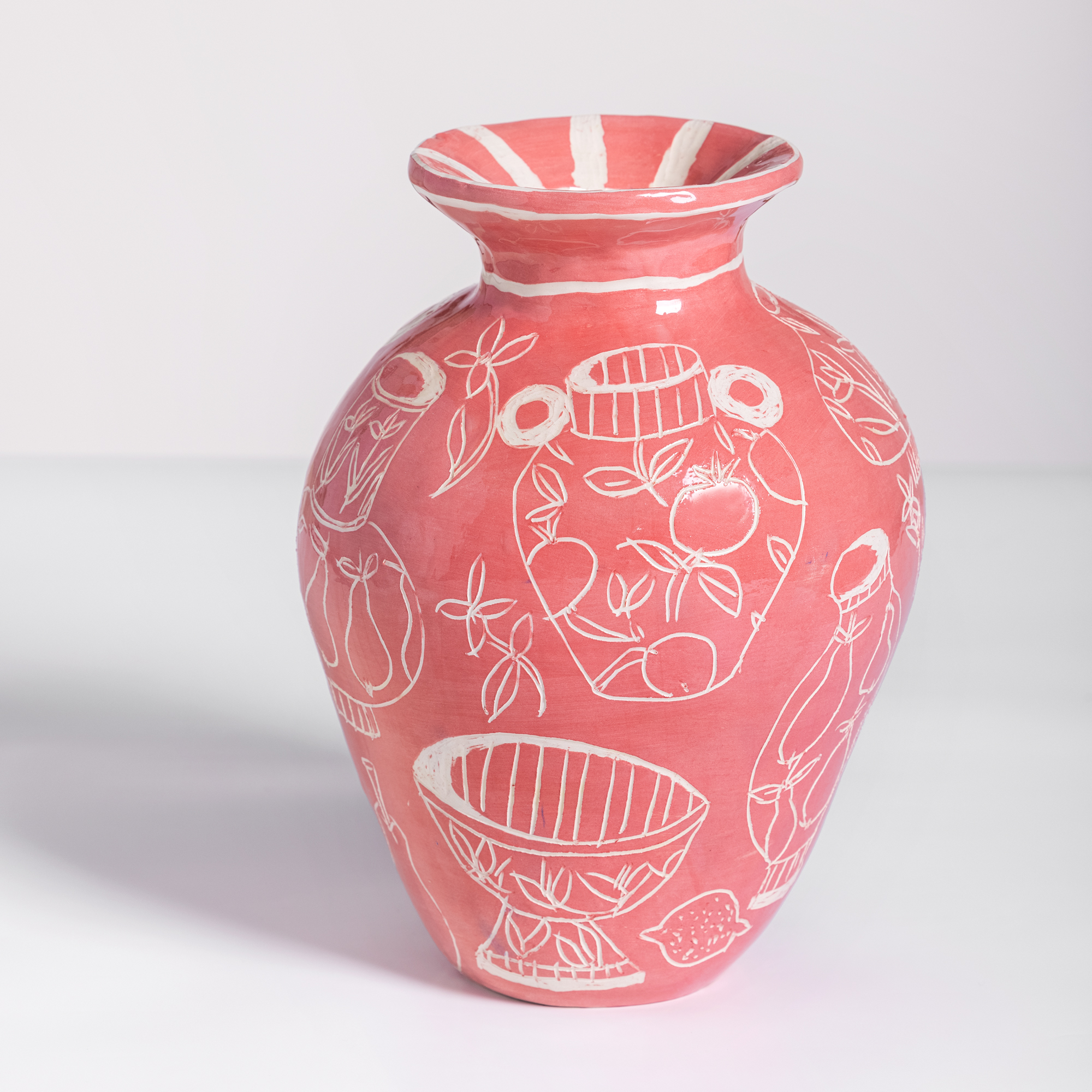 Low-temperature clay pieces are made with the ancient technique of rolling, which allows unique works to be built with free lines. Hand-painted with slip and “sgraffiato” technique. Finished with shiny glaze on the interior and exterior.