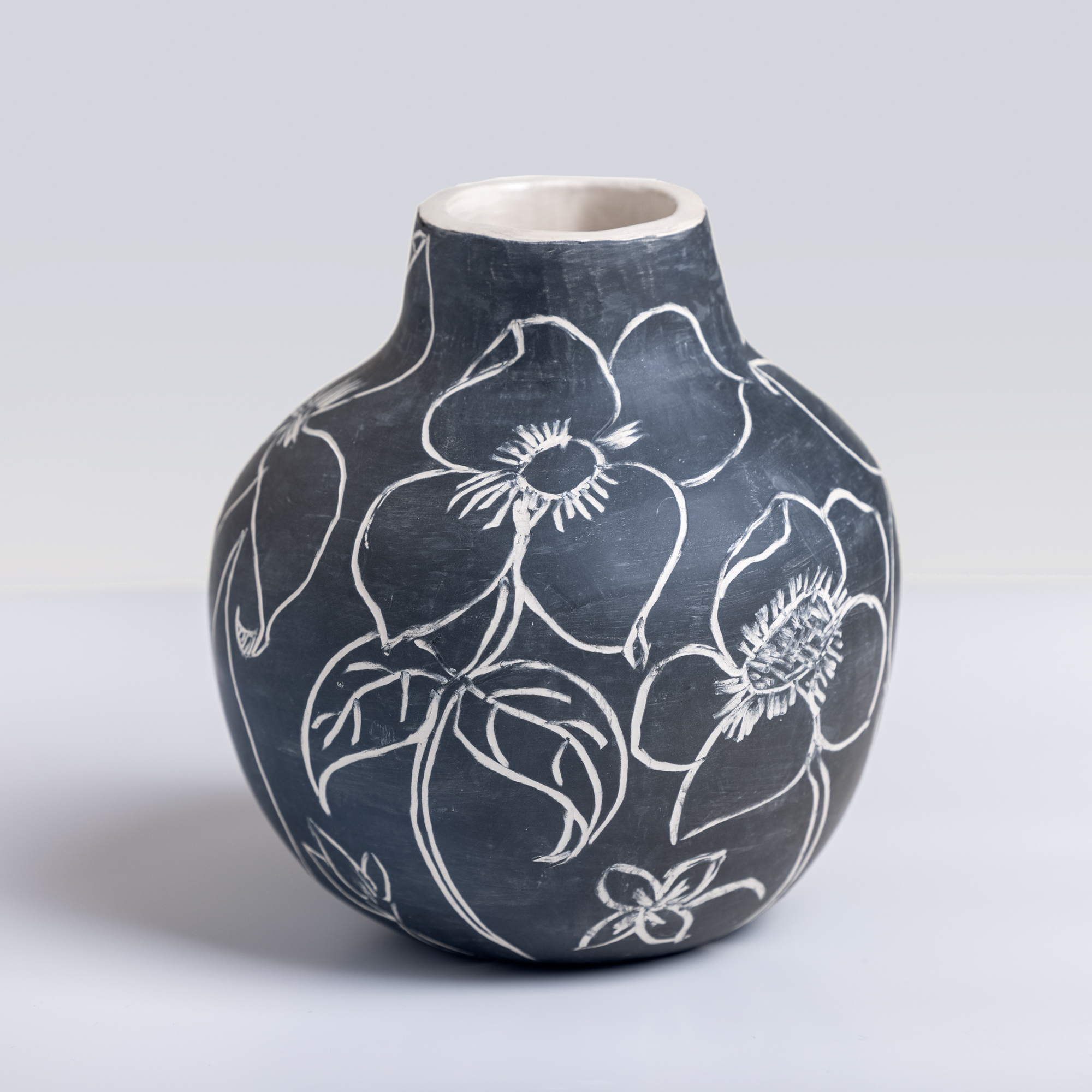 Low-temperature clay pieces are made with the ancient technique of rolling, which allows unique works to be built with free lines. Hand-painted with slip and “sgraffiato” technique. Finished with shiny glaze on the interior and bee’s wax on the exterior.