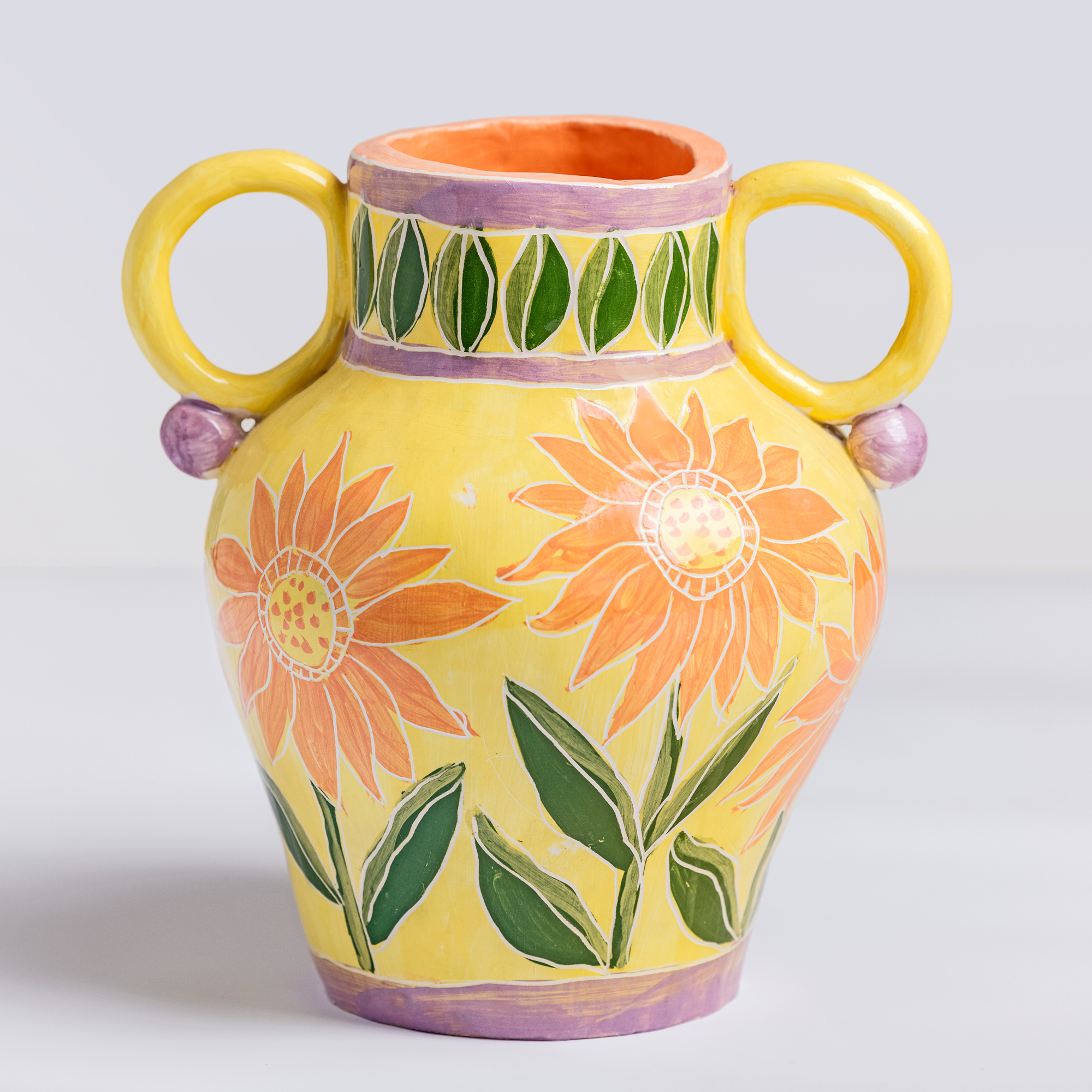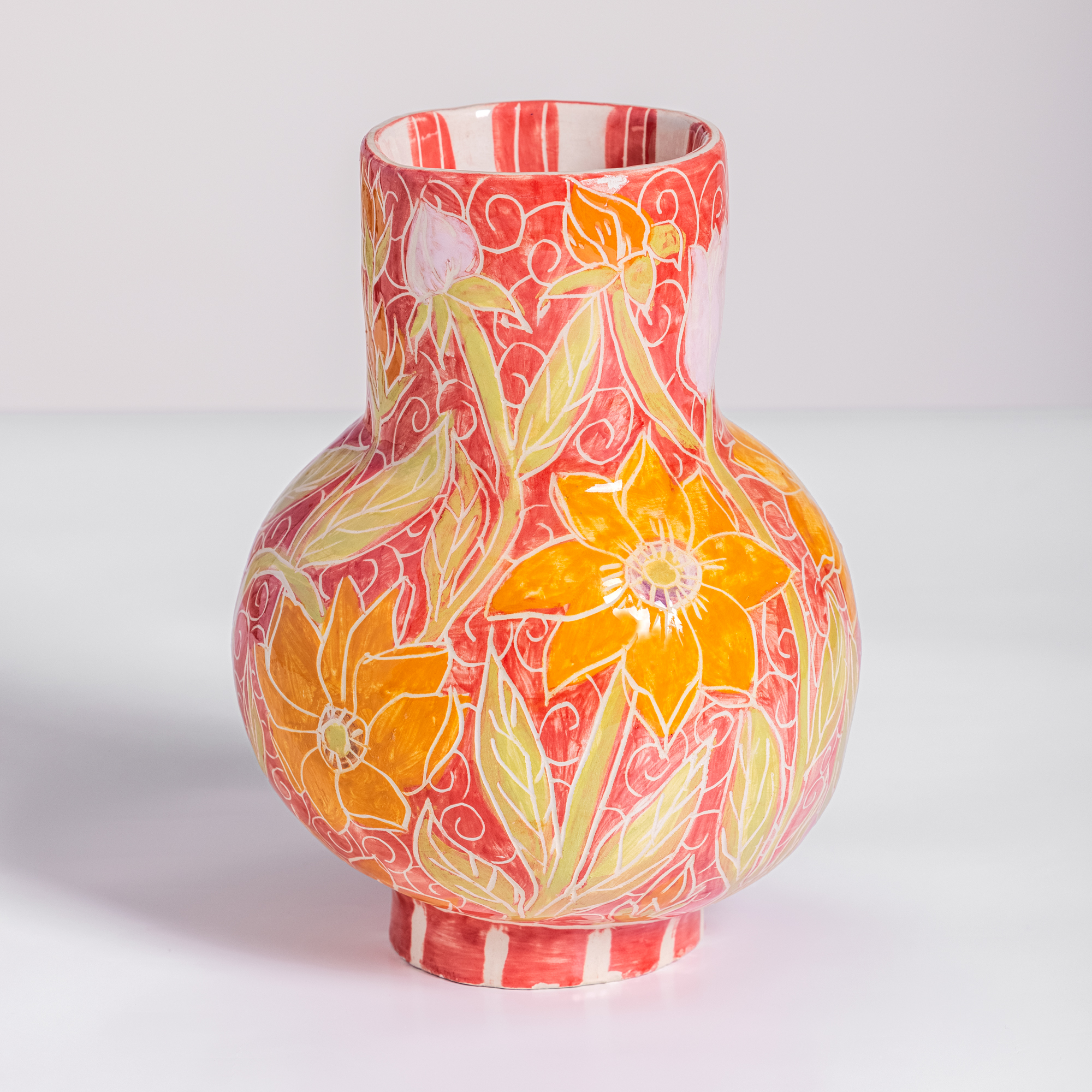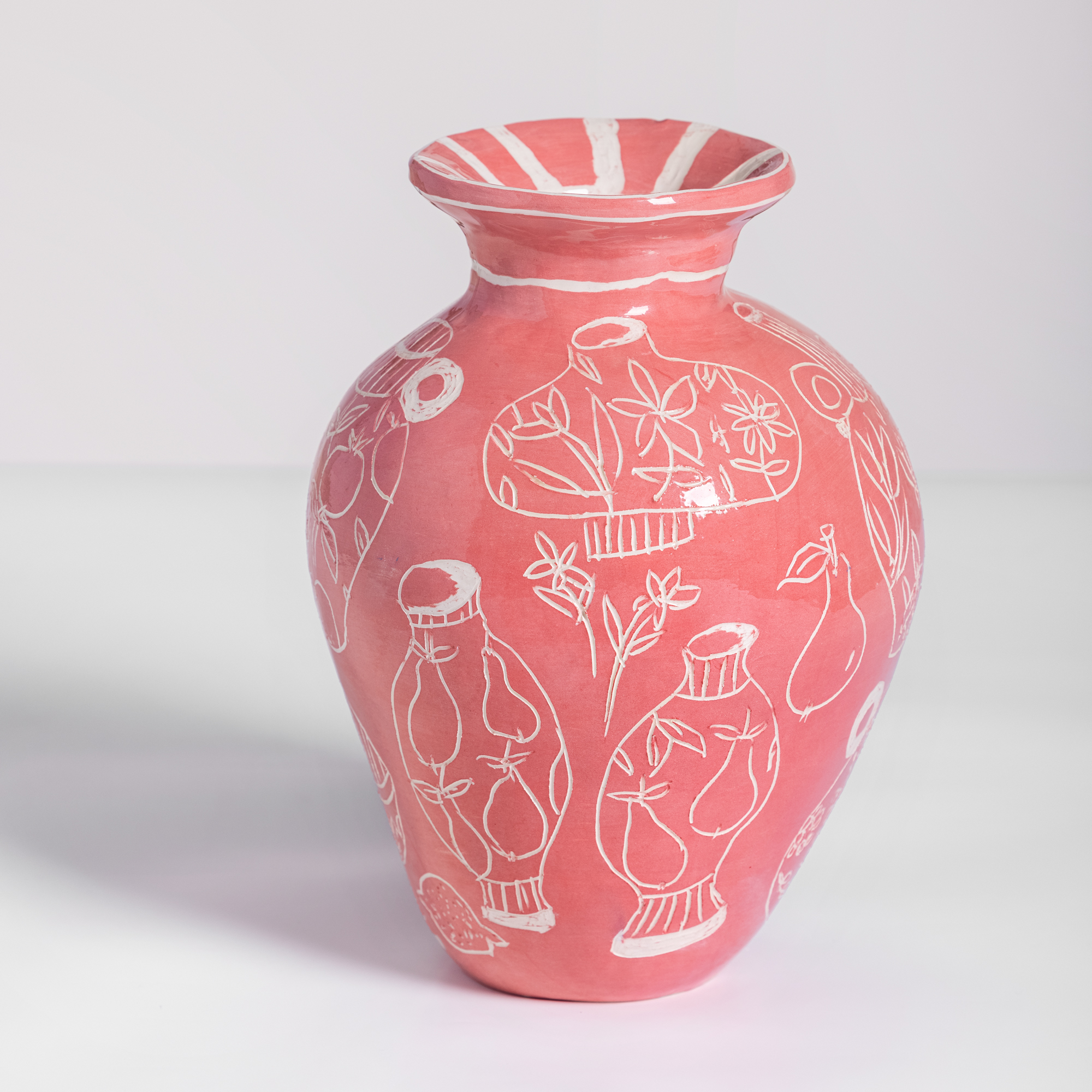 STILL LIFE OF VASE WITH FLOWERS ON PINK BACKGROUND