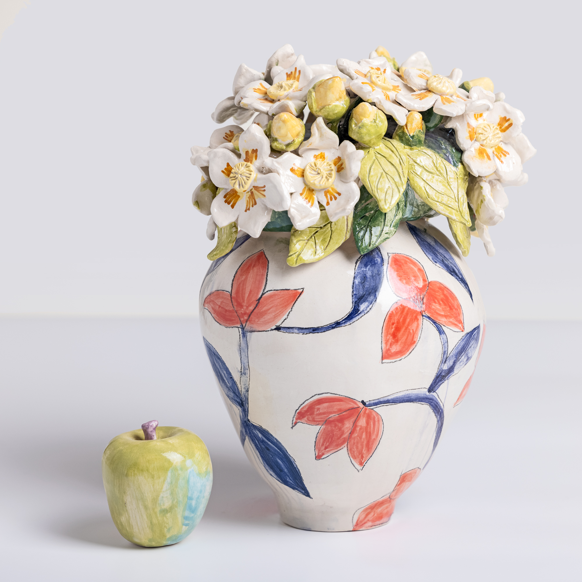 STILL LIFE OF VASE WITH WHITE FLOWERS AND GREEN APPLE