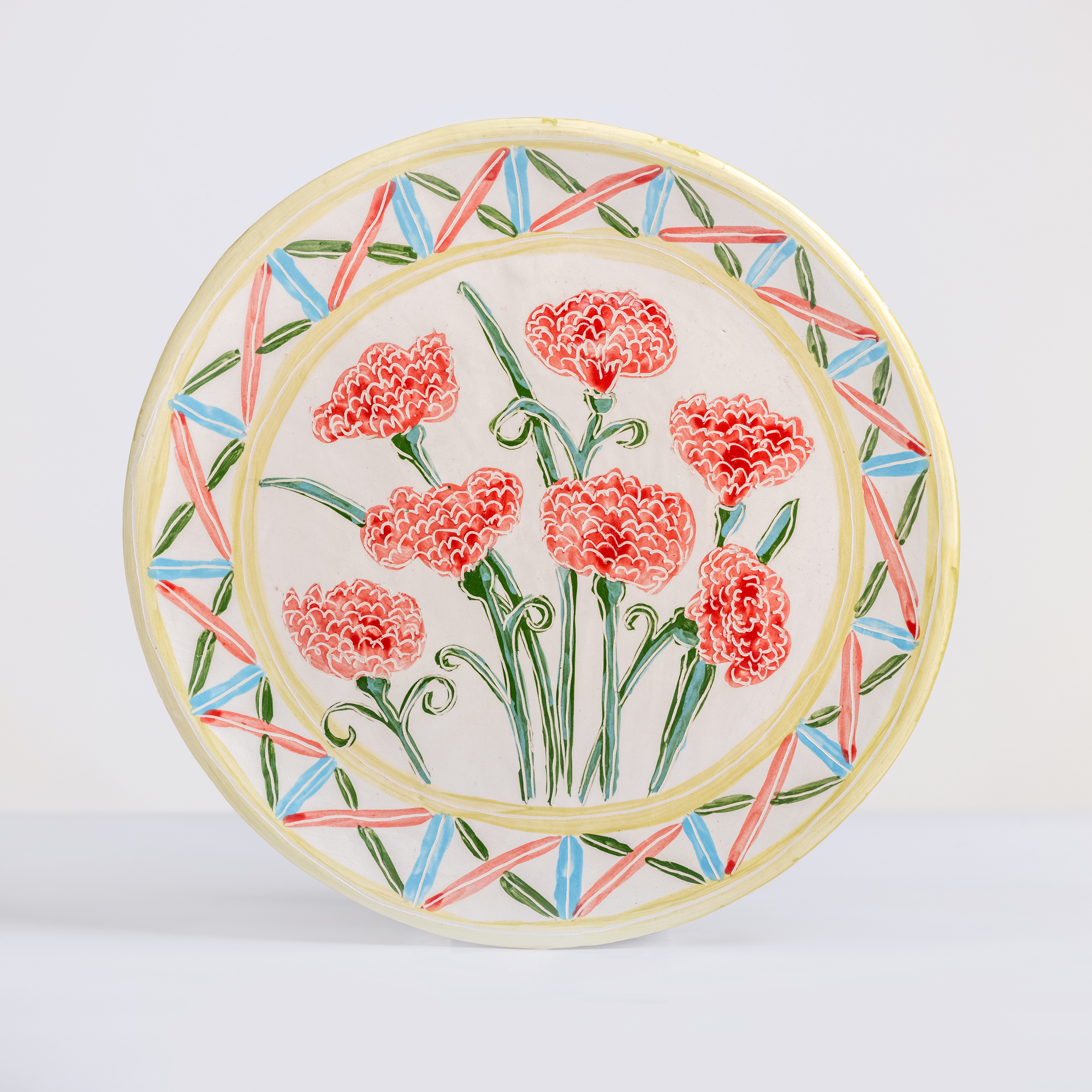 STILL LIFE WITH VASE OF FLOWERS AND FRUIT PLATE ON YELLOW BACKGROUND