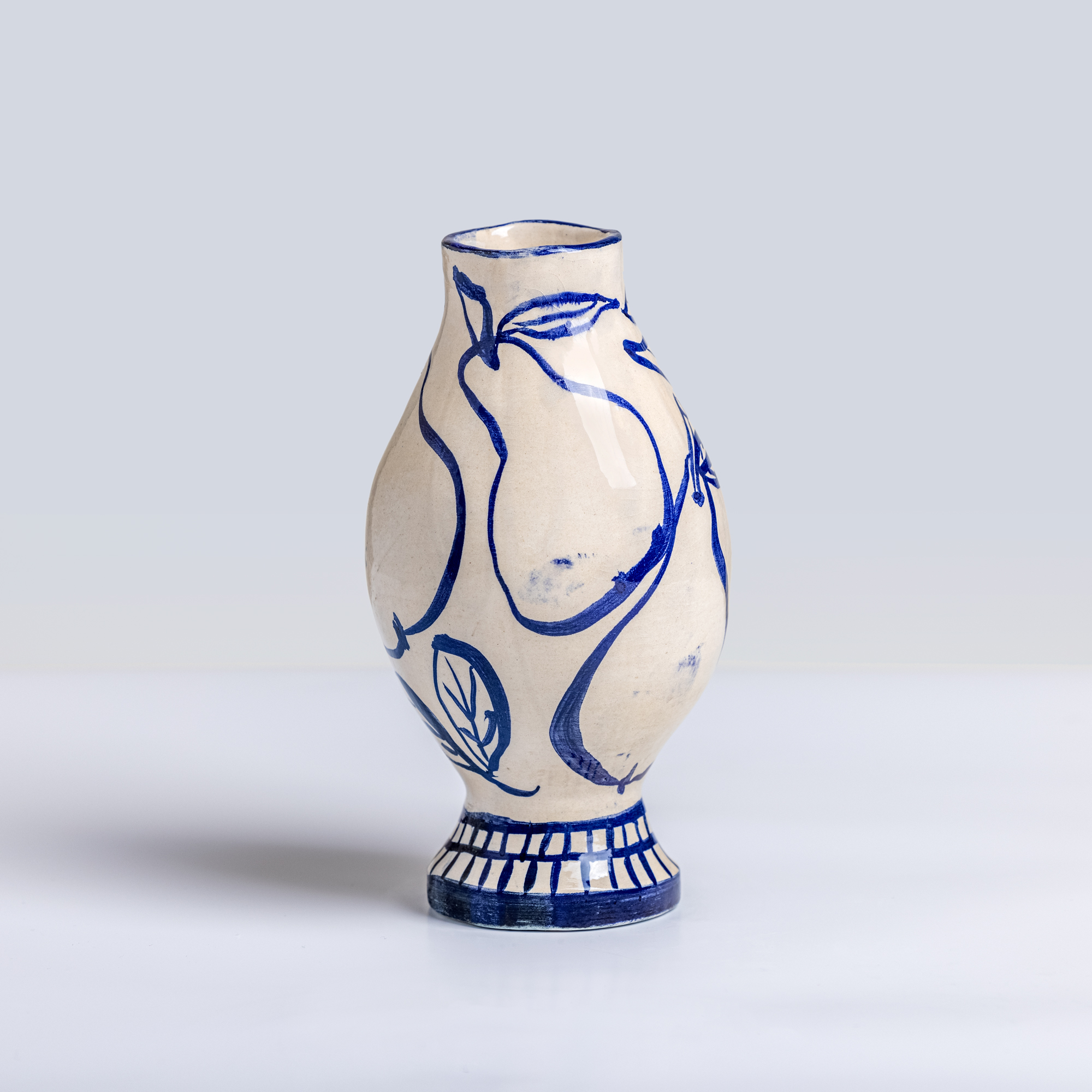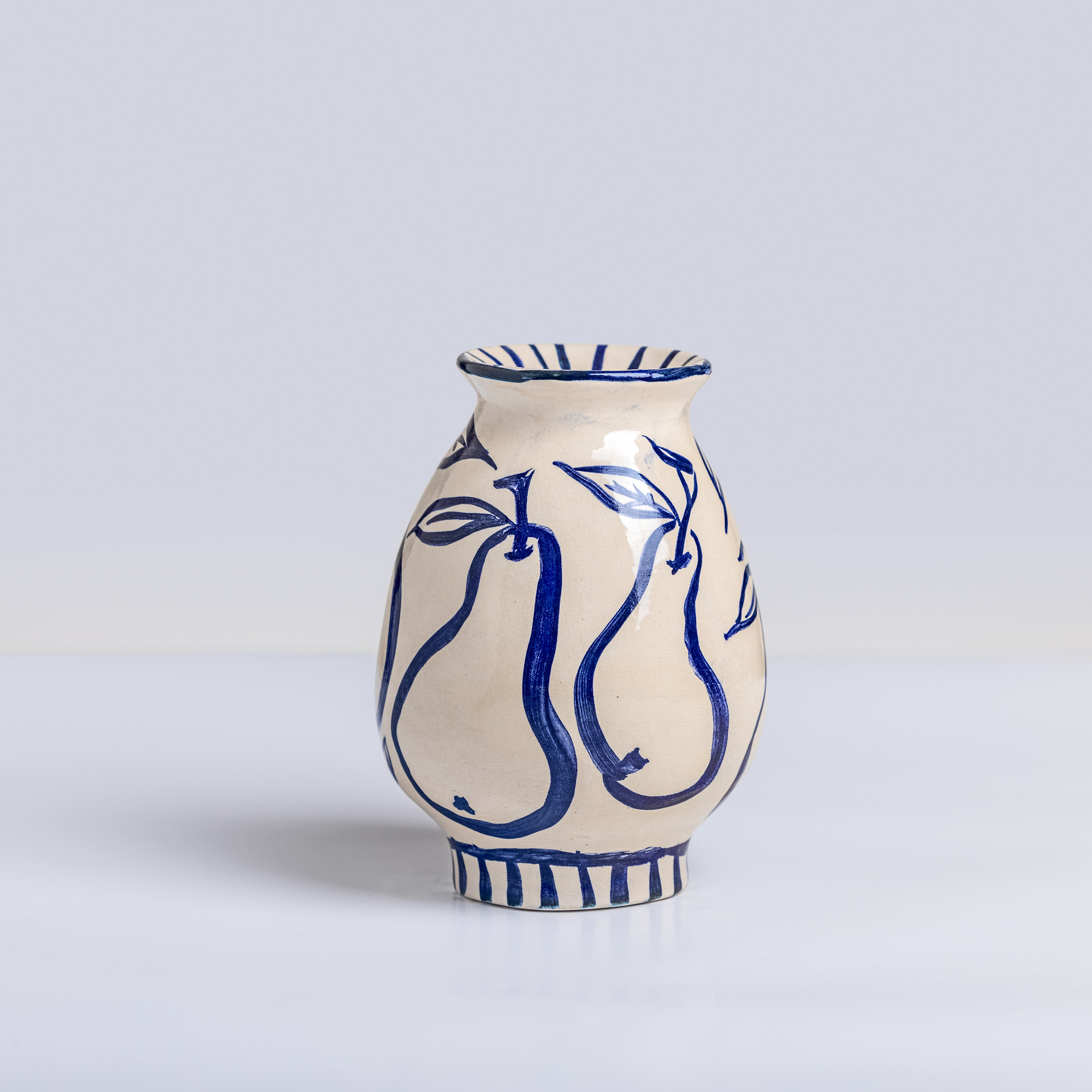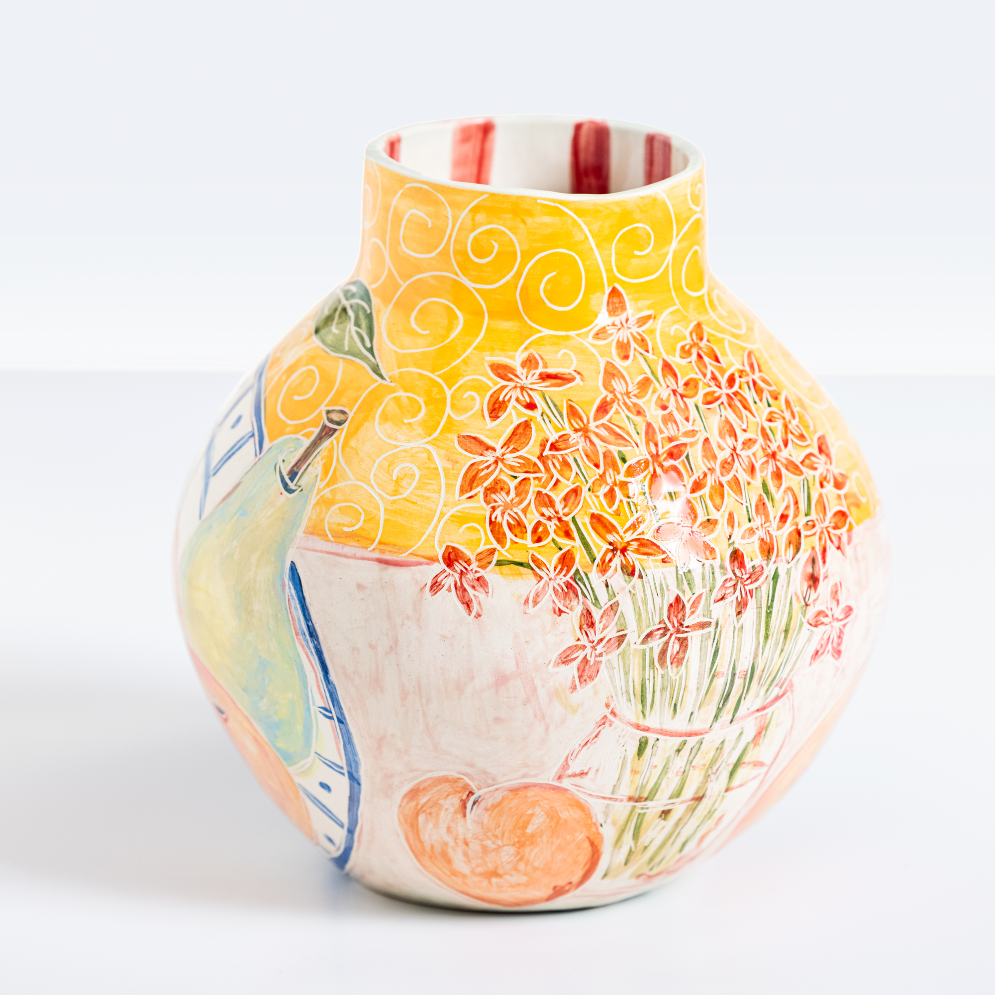 STILL LIFE OF VASE WITH PAINTED FLOWERS AND A PEAR
