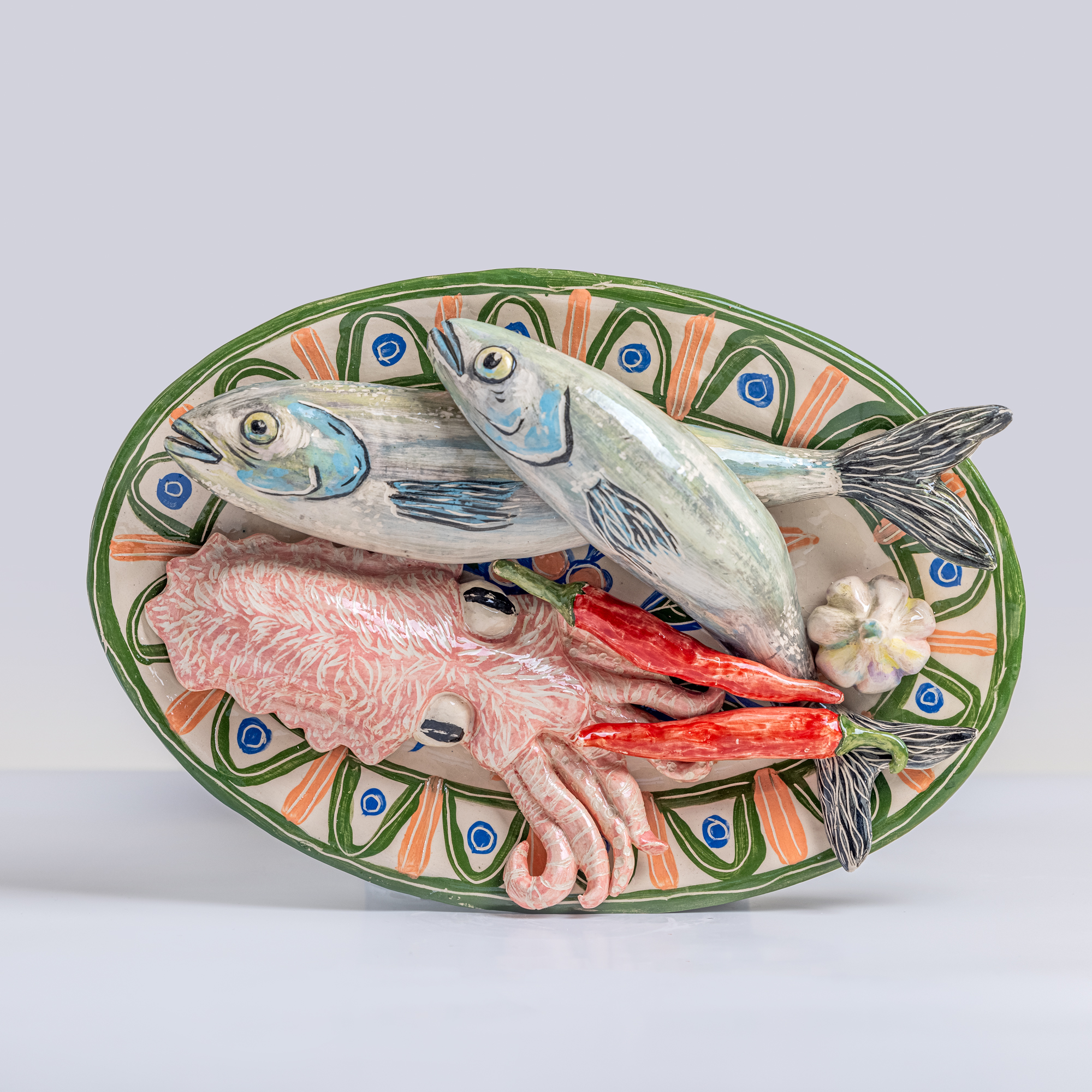 STILL LIFE WITH SEA BASS, CUTTLEFISH, CHILI AND HEAD OF GARLIC