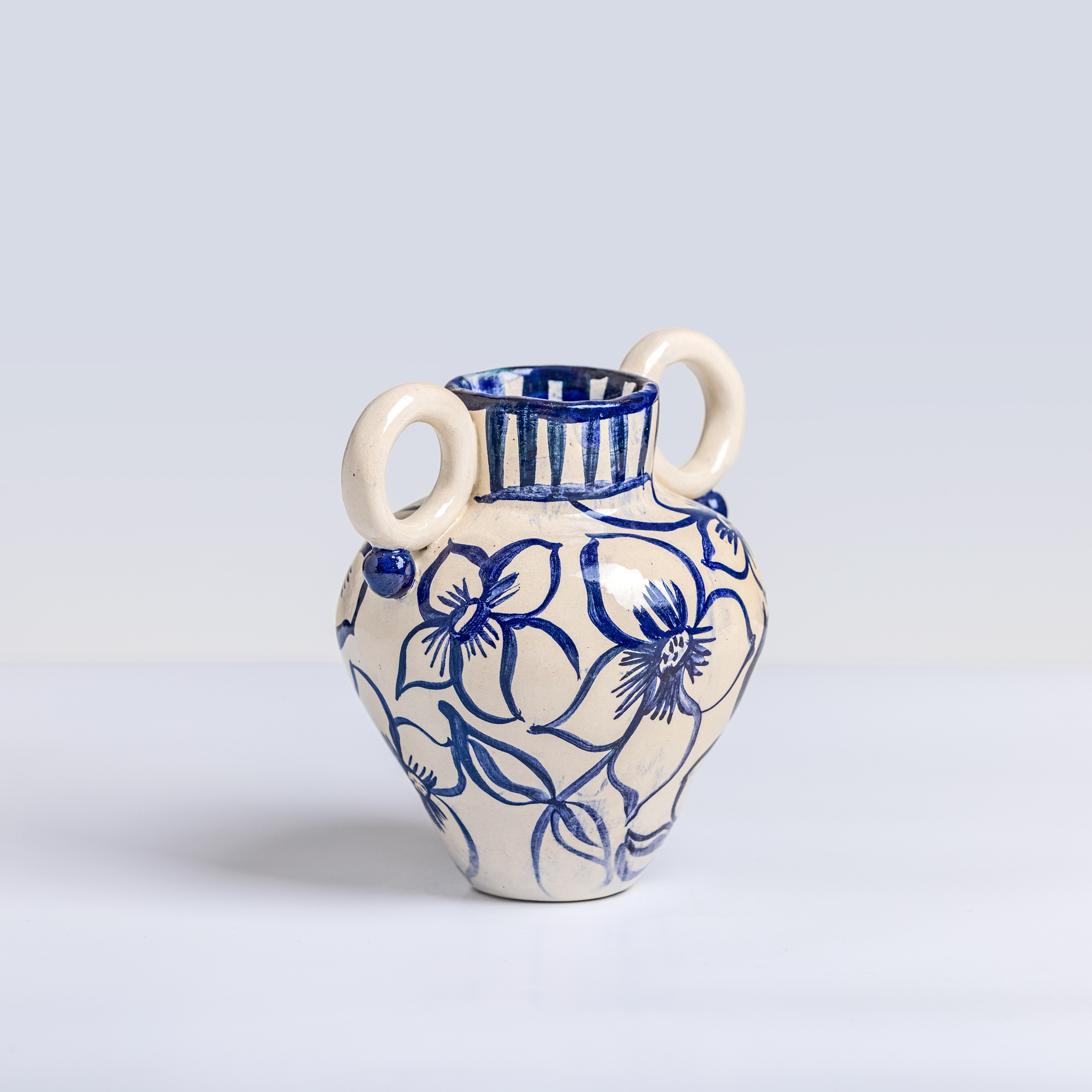 Low-temperature clay pieces are made with the ancient technique of rolling, which allows unique works to be built with free lines. Hand-painted with slip. Finished with shiny glaze on the interior and exterior.