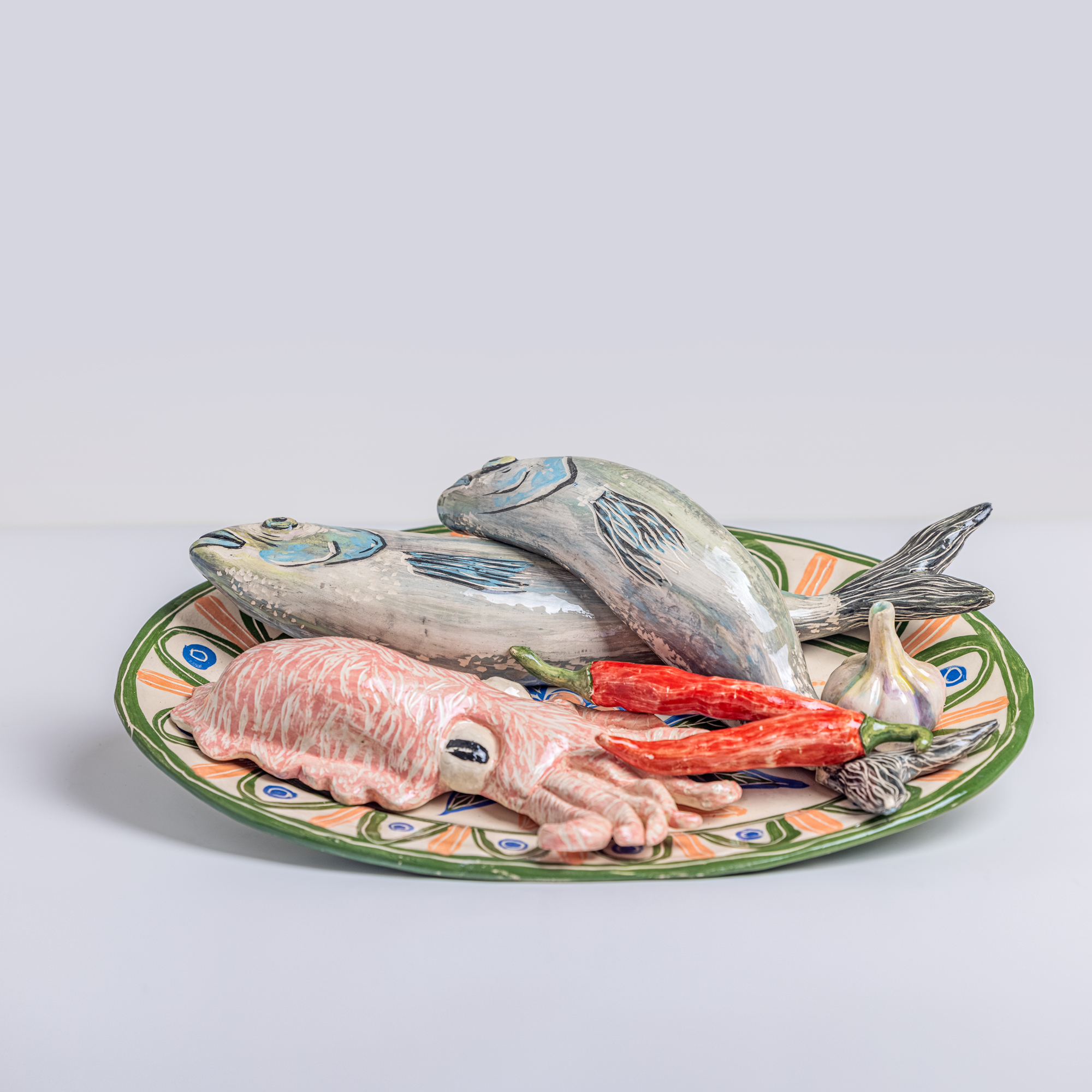 Low-temperature clay pieces are made with the ancient technique of rolling, which allows unique works to be built with free lines. Hand-painted with slip. Finished with shiny glaze on the interior and exterior.