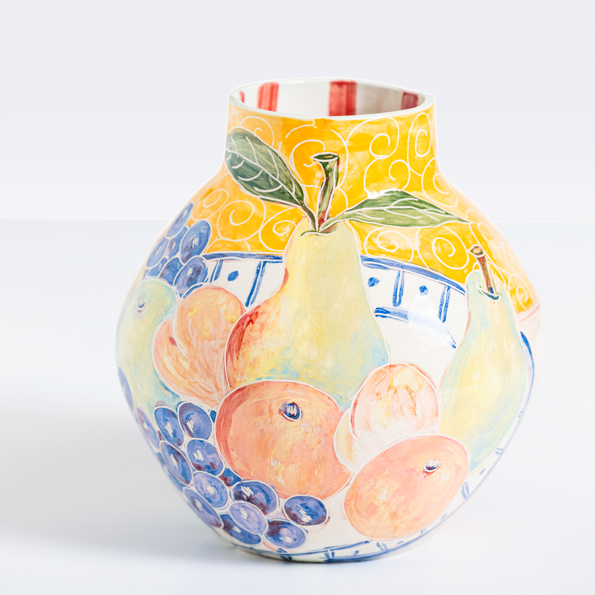 Low-temperature clay pieces are made with the ancient technique of rolling, which allows unique works to be built with free lines. Hand-painted with slip. Finished with shiny glaze on the interior and exterior.