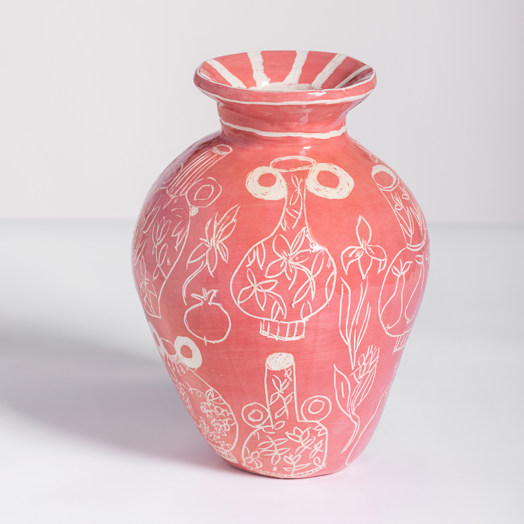 Low-temperature clay pieces are made with the ancient technique of rolling, which allows unique works to be built with free lines. Hand-painted with slip and “sgraffiato” technique. Finished with shiny glaze on the interior and exterior.