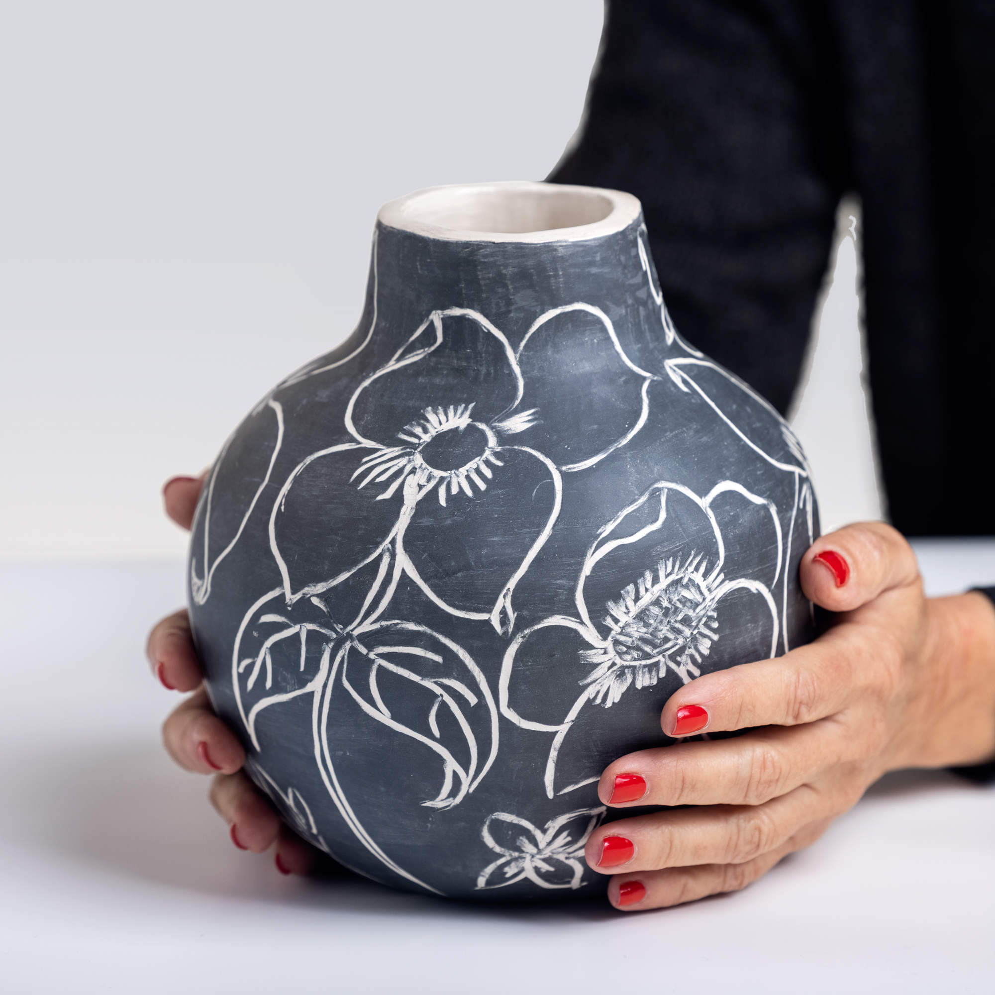 Low-temperature clay pieces are made with the ancient technique of rolling, which allows unique works to be built with free lines. Hand-painted with slip and “sgraffiato” technique. Finished with shiny glaze on the interior and bee’s wax on the exterior.